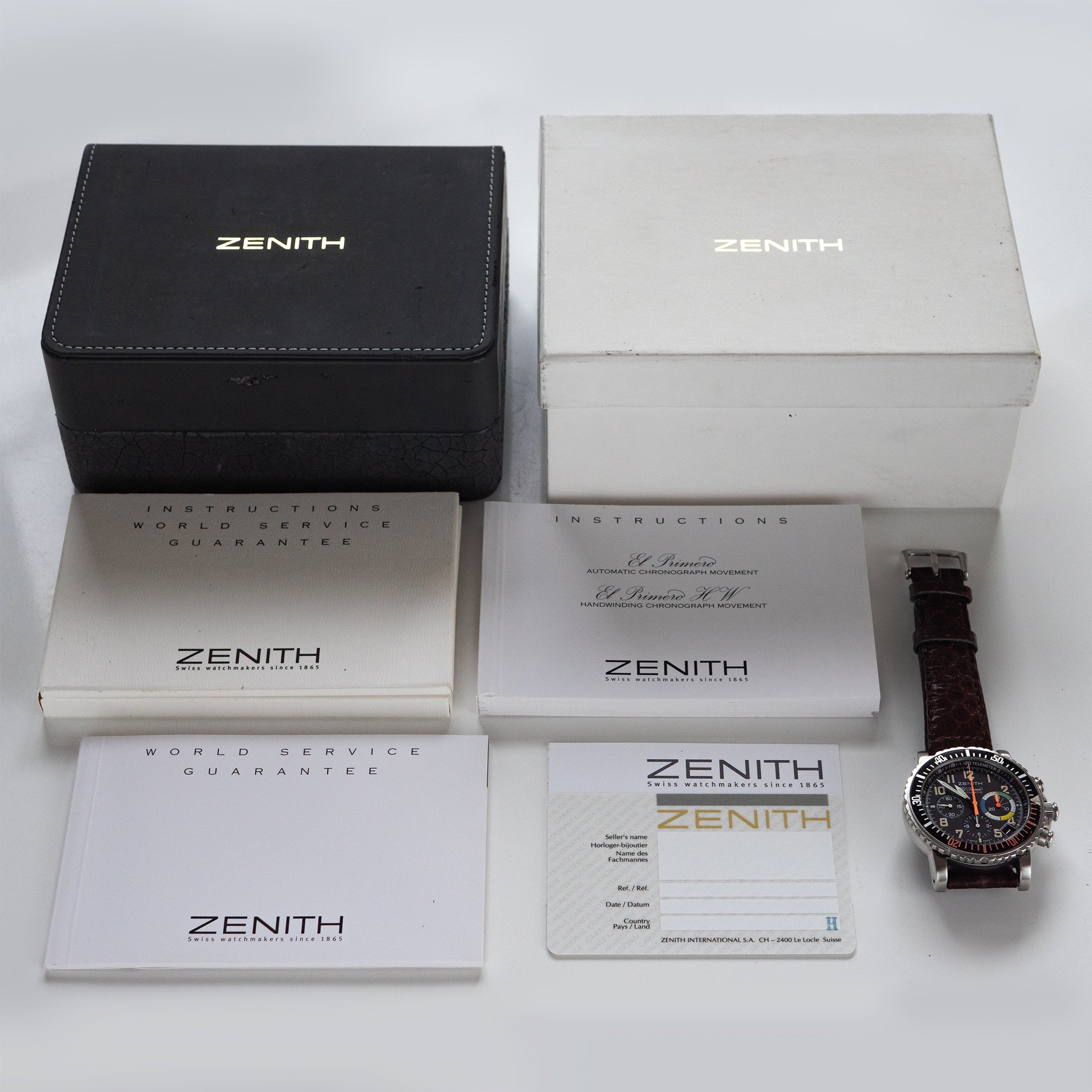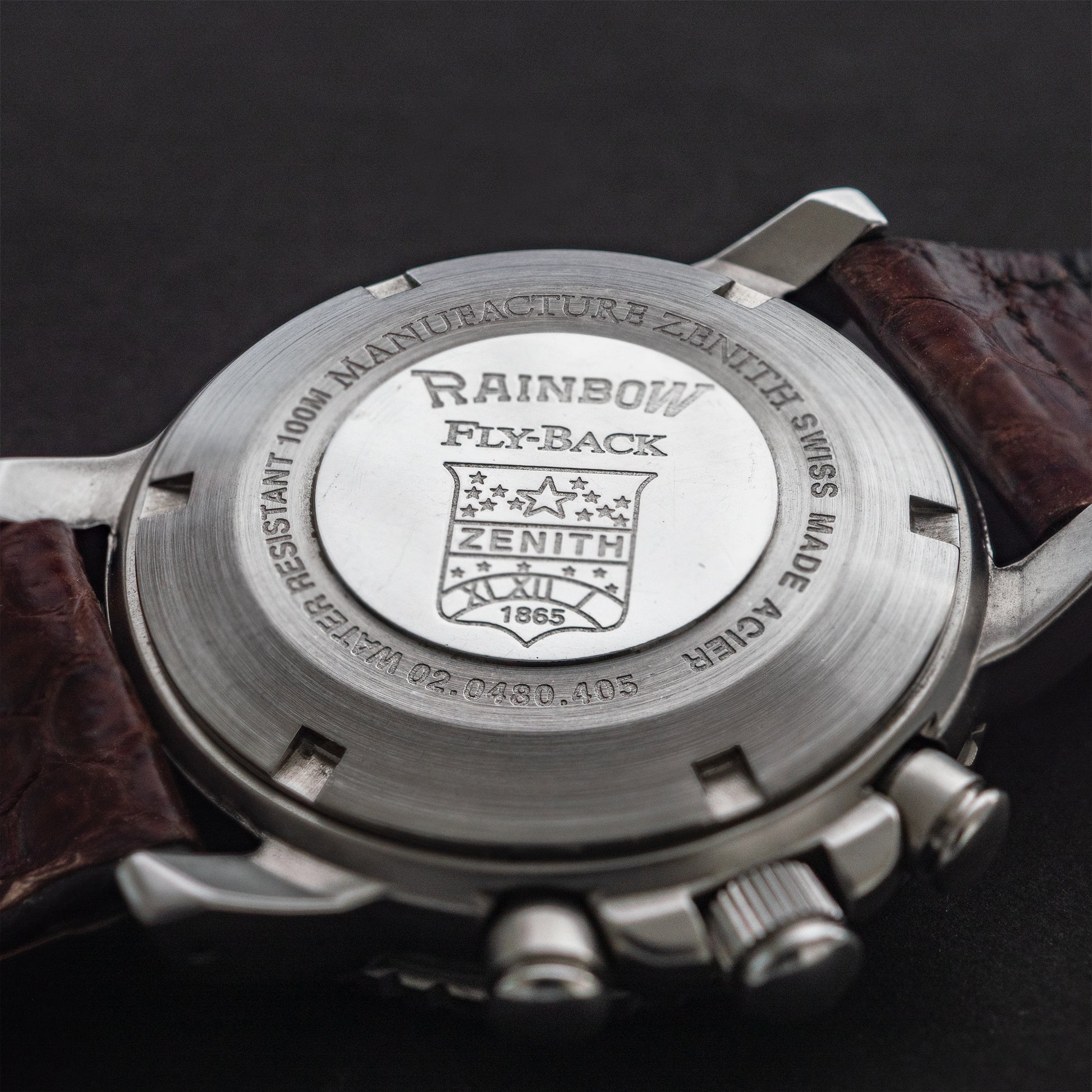 In the late 1990s the French Ministry of Defence was seeking for a watch for its fighter pilots. Zenith responded the bid for tender launched by the French Ministry of Defence by presenting the reliable and resistant Rainbow Fly-Back model in 1997. Its steel case had a diameter of 40 mm, therefore the readability from the big dial was outstanding and the accuracy of the Zenith El Primero calibre 400 under all conditions at the level desired by the French Ministry of Defence.