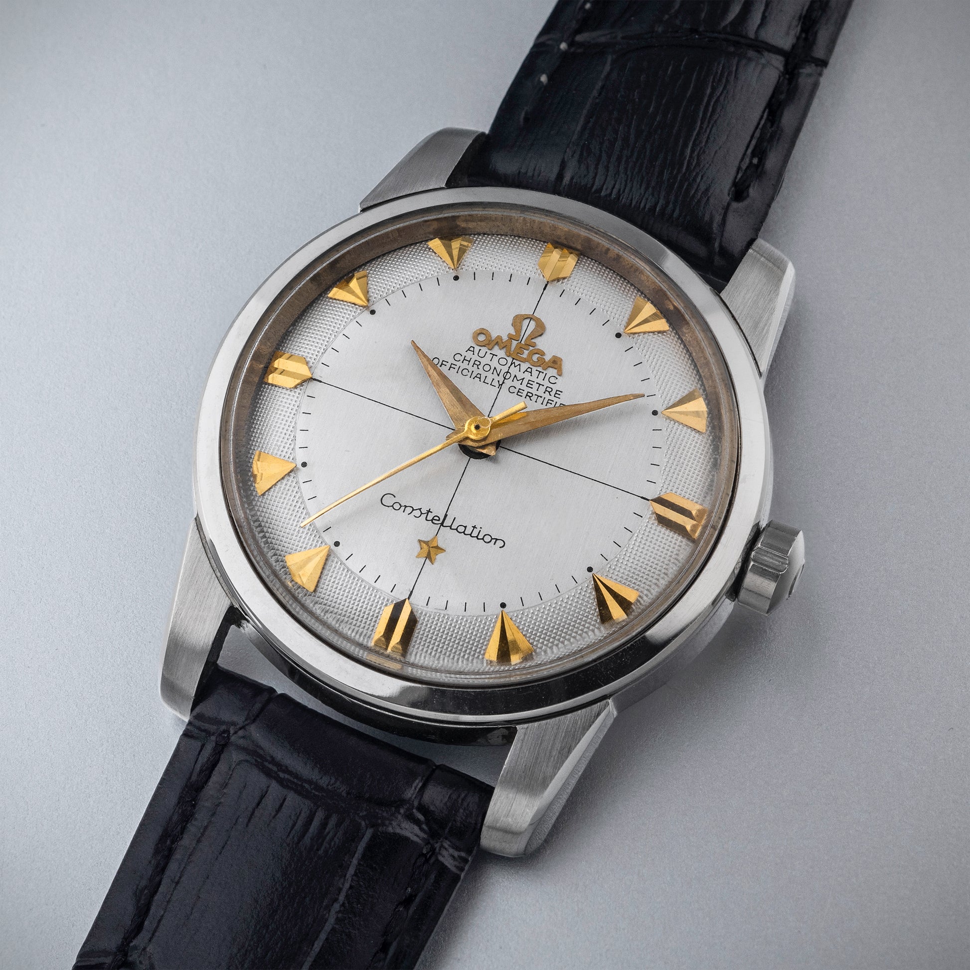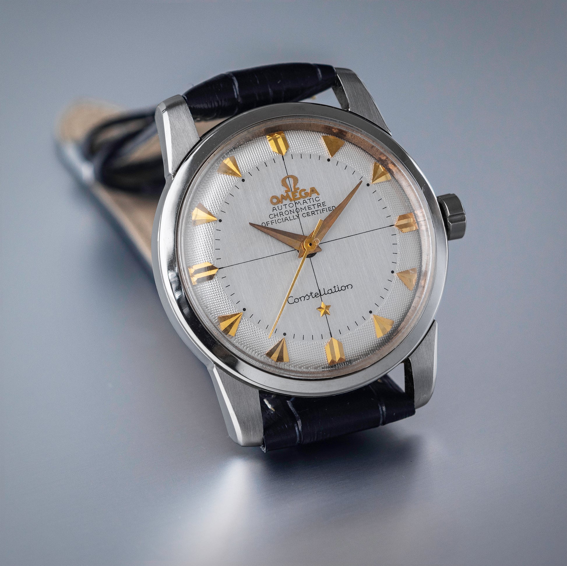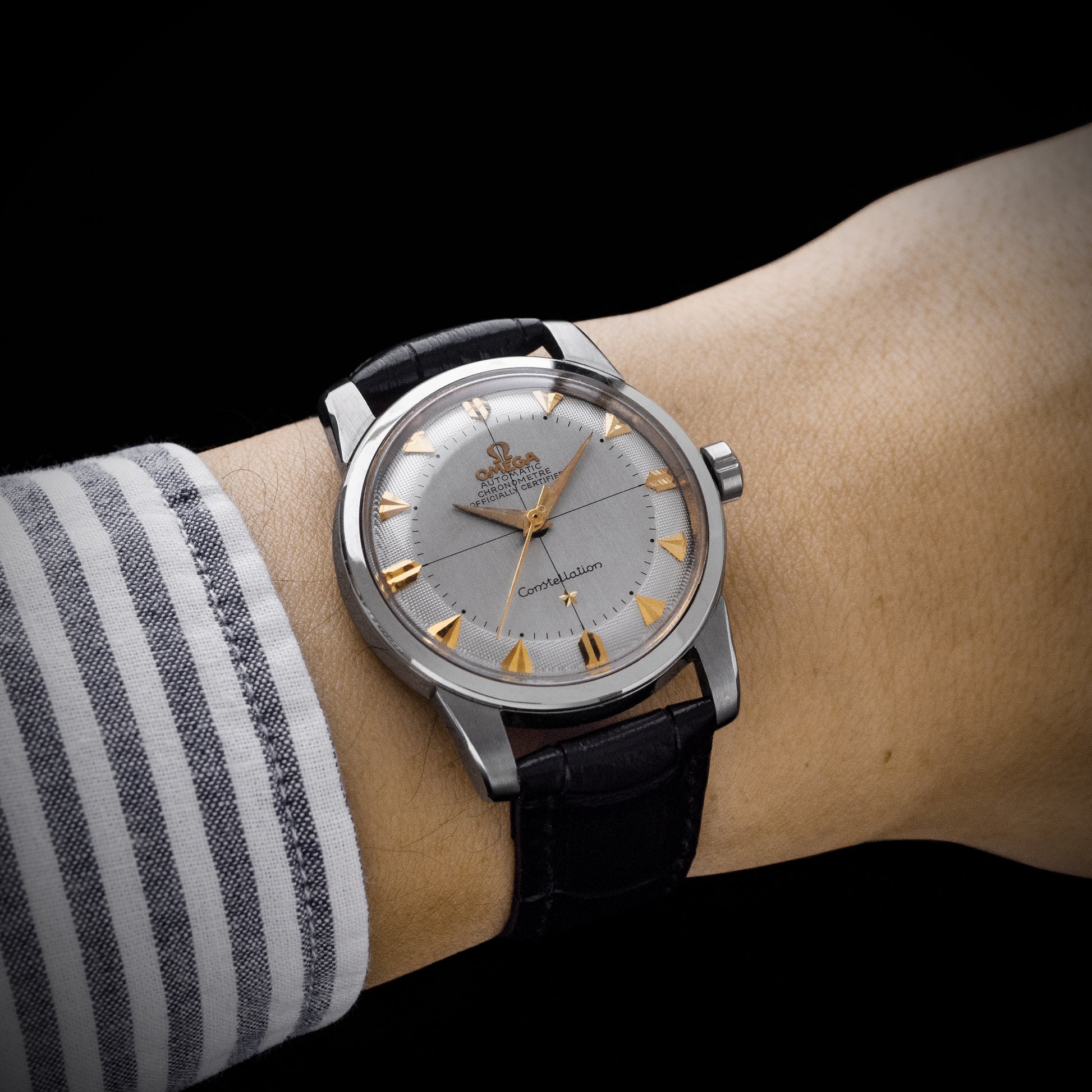 This Omega Constellation from 1950 is highly sort after by collectors because of it extremely rare original crosshair two-tone textured dial with arrowhead indexes. This is truly a beautiful piece that any watch collector can appreciate. This watch has been serviced by our local watchmaker at the end of 2021.