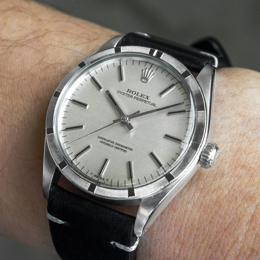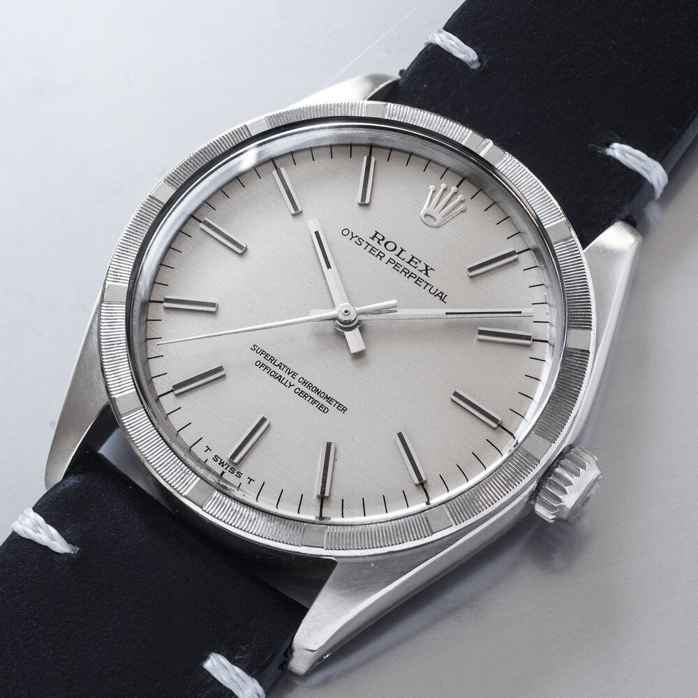 The Oyster Perpetual is simply a great watch, loved by countless numbers of new and seasoned collectors. This example has a 34mm, stainless steel case and a silvered dial. It’s versatile, legible, and durable for daily wear or to a formal event. For this particular watch, the non-date dial configuration allows the overall design to be uncluttered. The icing on the cake is the engine-turned bezel which adds to the character of the watch without disturbing its otherwise clean design. Although it's over 50 years old, this watch looks as good today as it did in 1966.