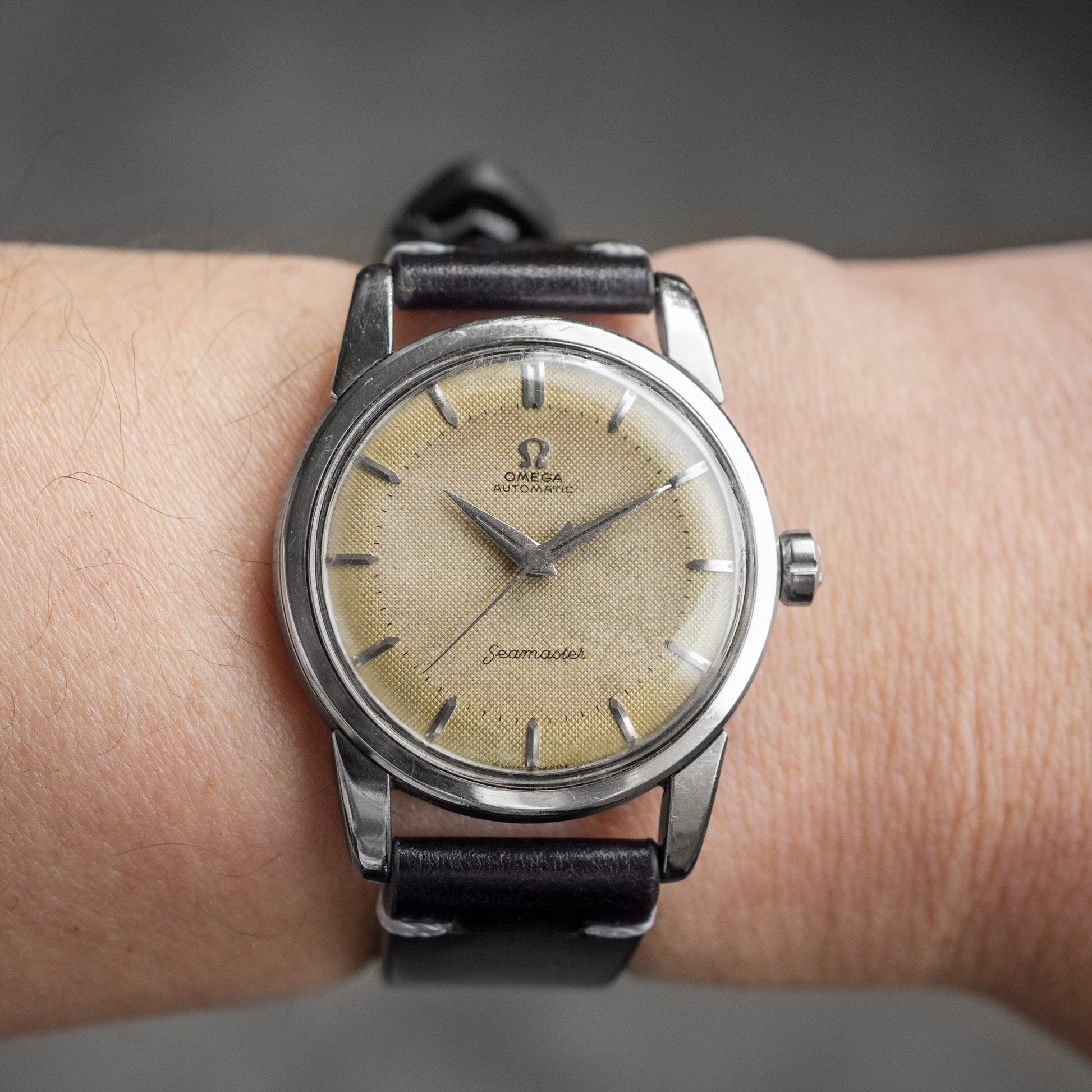 This Omega Seamaster from 1957 features a honeycomb textured dial. This is truly a beautiful piece that any watch collector can appreciate.