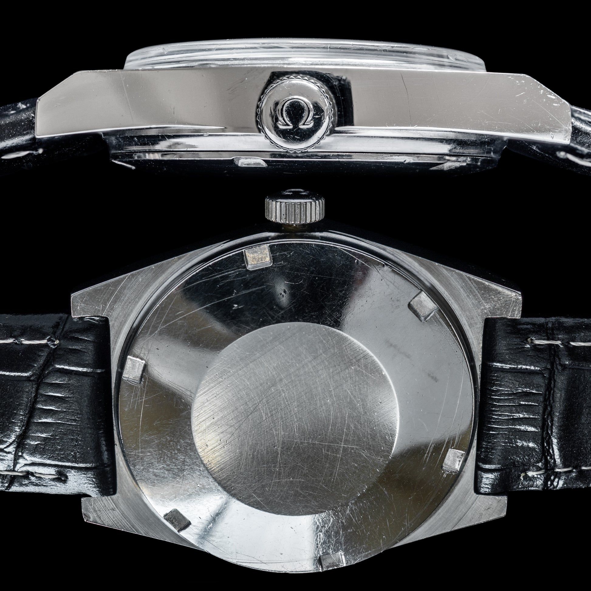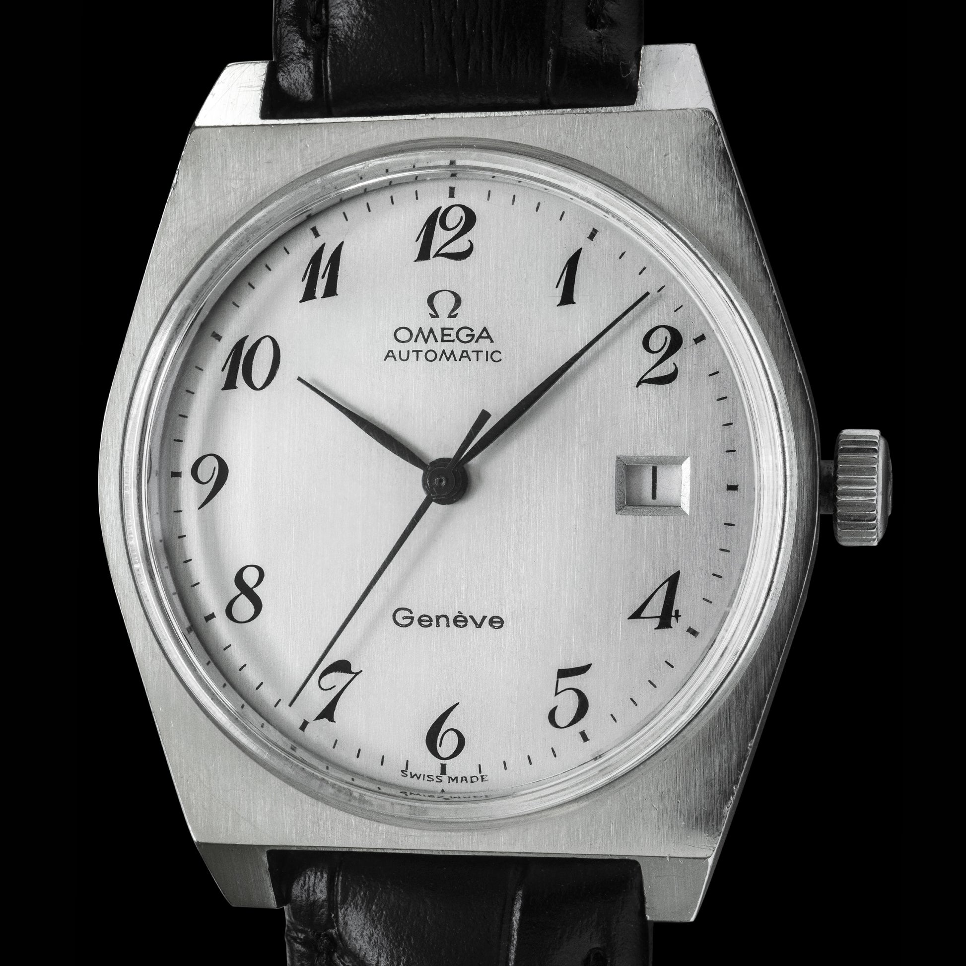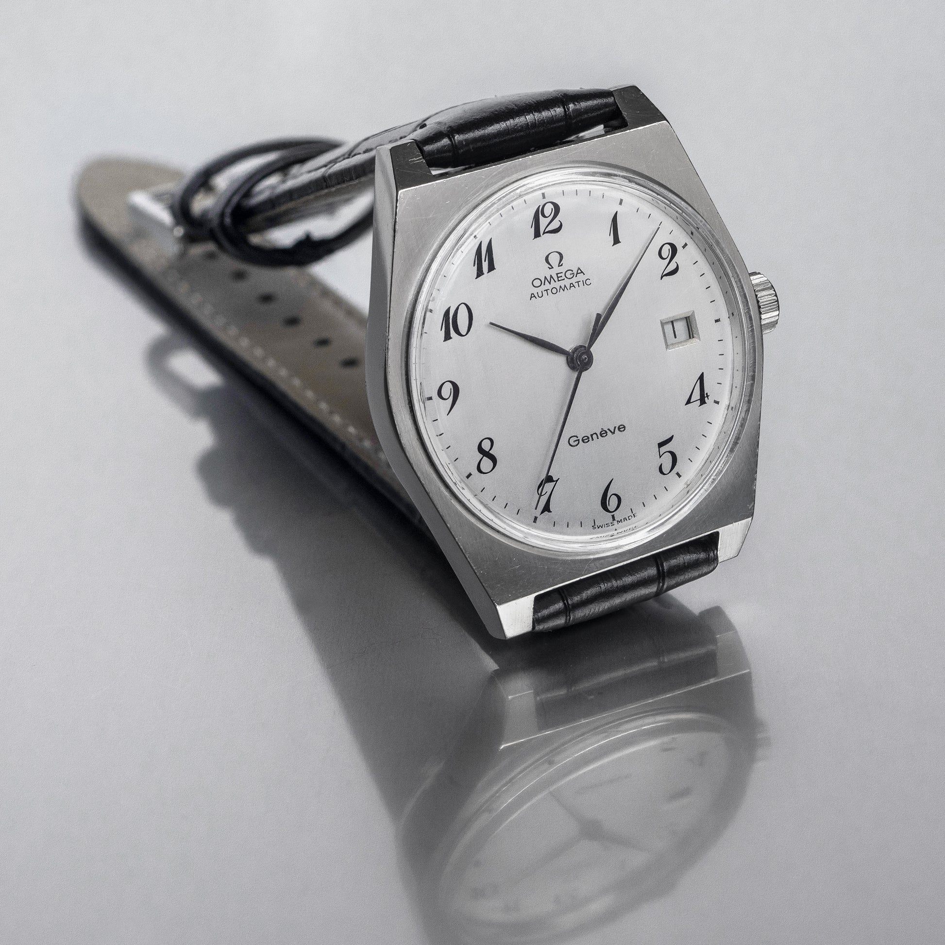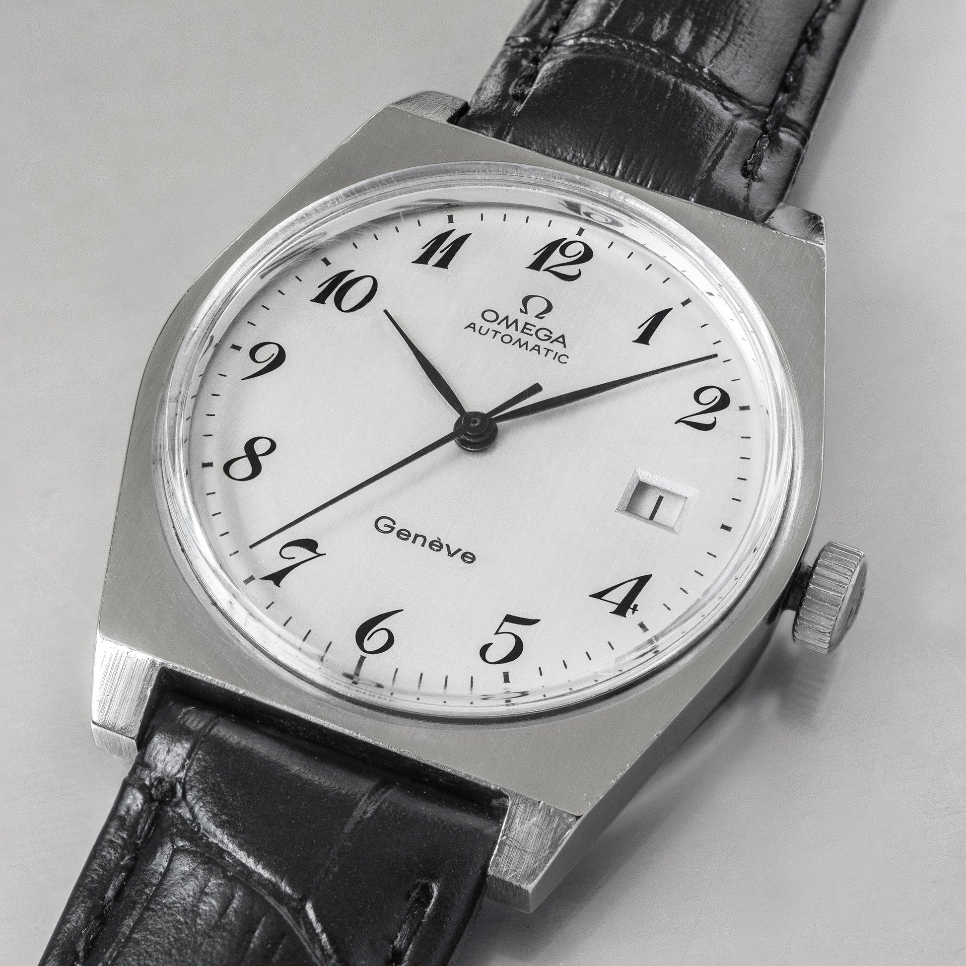 This rare Omega Geneve from 1972 features a stunning white vertical brushed full numeral dial. Its barrel-shaped steel case has quite the wrist presents despite its 35mm case size. Another unique point for this watch is its Omega Cal. 1481 movement (based on Tissot's Cal. 784), which lets the wearer to forward the date by simply pushing down on the crown (this is the reason the crown sits higher than usual). This is truly a beautiful and interesting piece that any watch collector can appreciate.