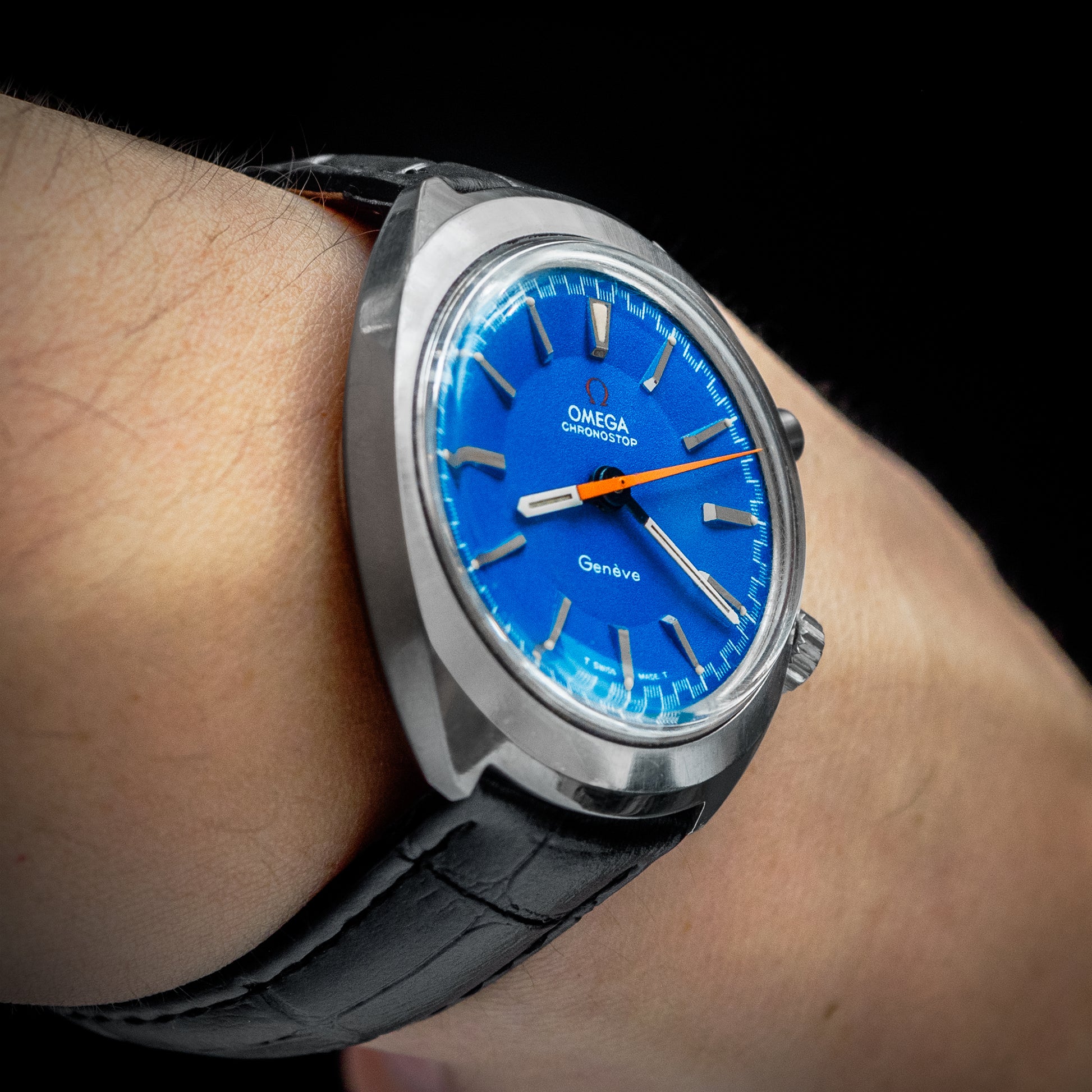 This Omega Geneve Chronostop from the 1968 features a stunningly beautiful matte blue dial with orange Omega logo and a matching orange chronograph hand.
