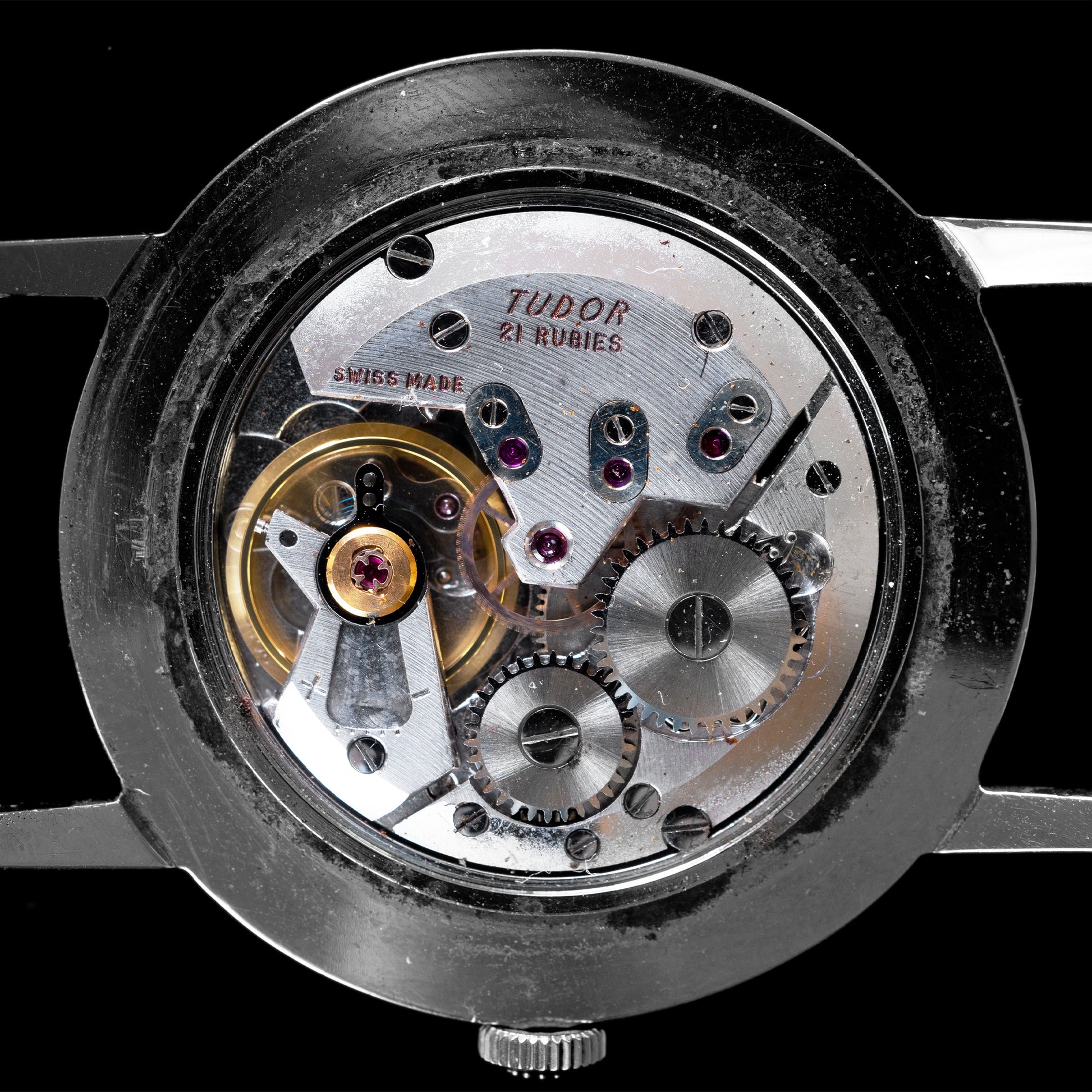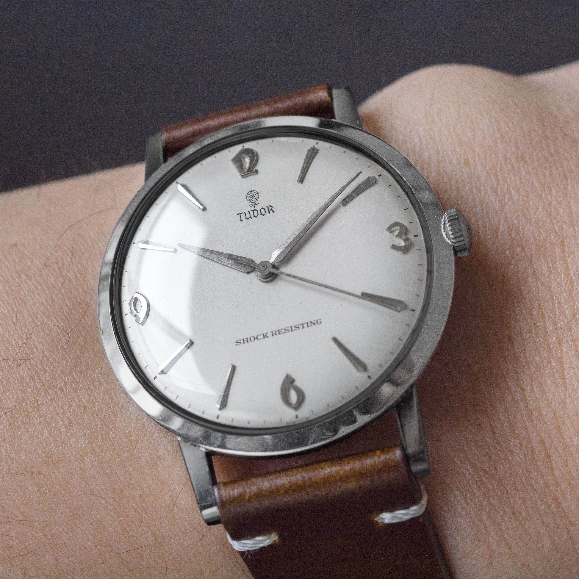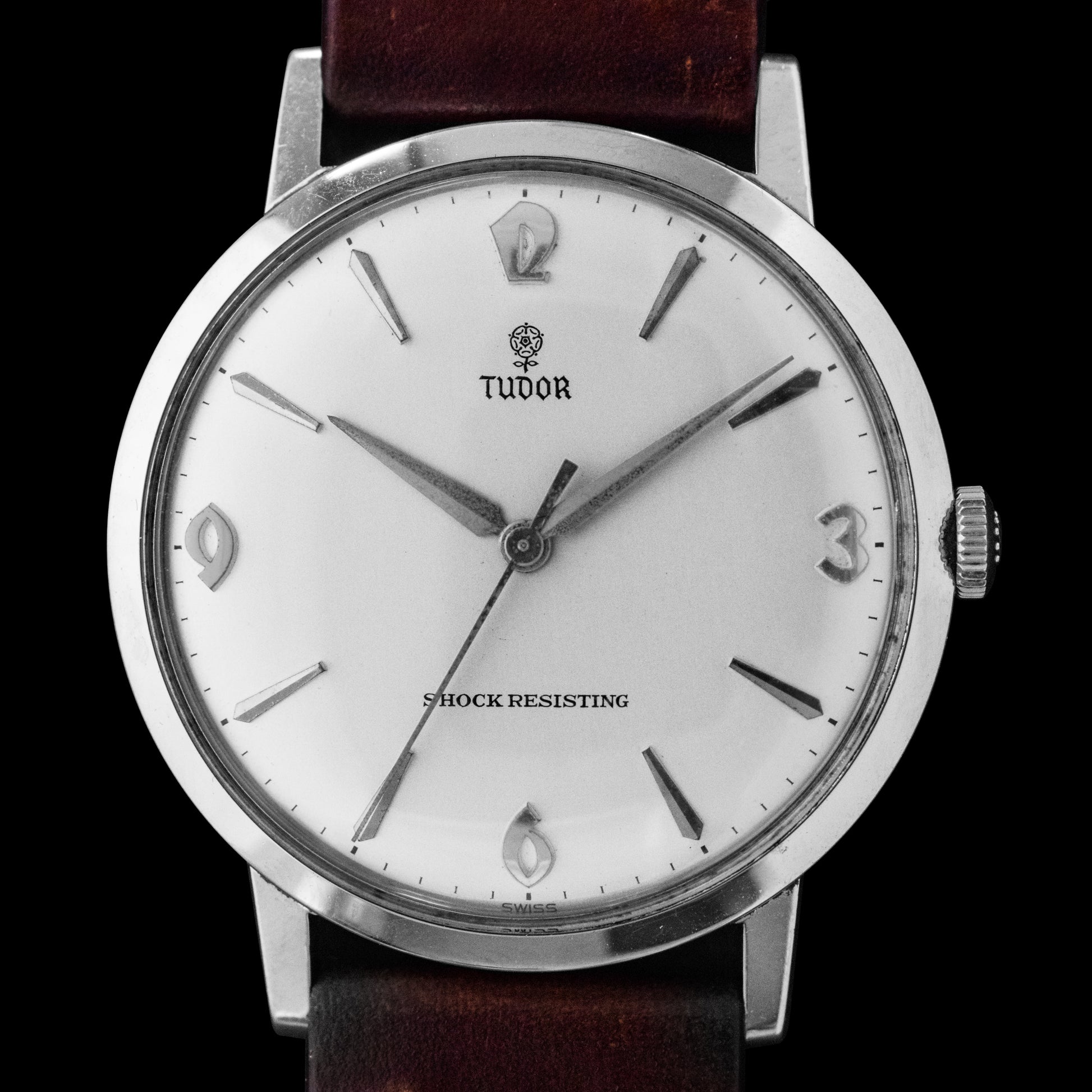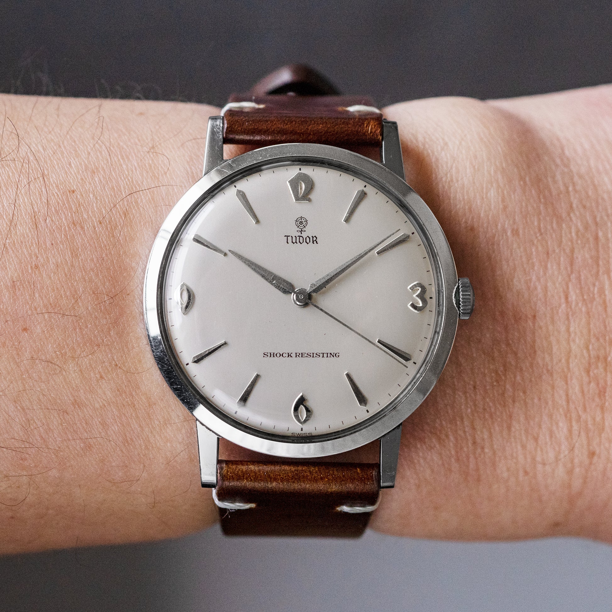 Throughout its history, Tudor has produced a wide variety of wearable watches ranging from classic dress watches to hefty chronographs, but always with some noticeable accents such as interesting hands, numerals, and colors. Perhaps because the brand was positioned under Rolex, Tudor was allowed more flexibility for creativity that Rolex could not exercise. This model keeps things elegant and understated with a smooth bezel and clean silver dial. What really sets this piece apart, though, are the small details: the small Tudor rose logo, unusual numeral style, and sharp luminous alpha hands.