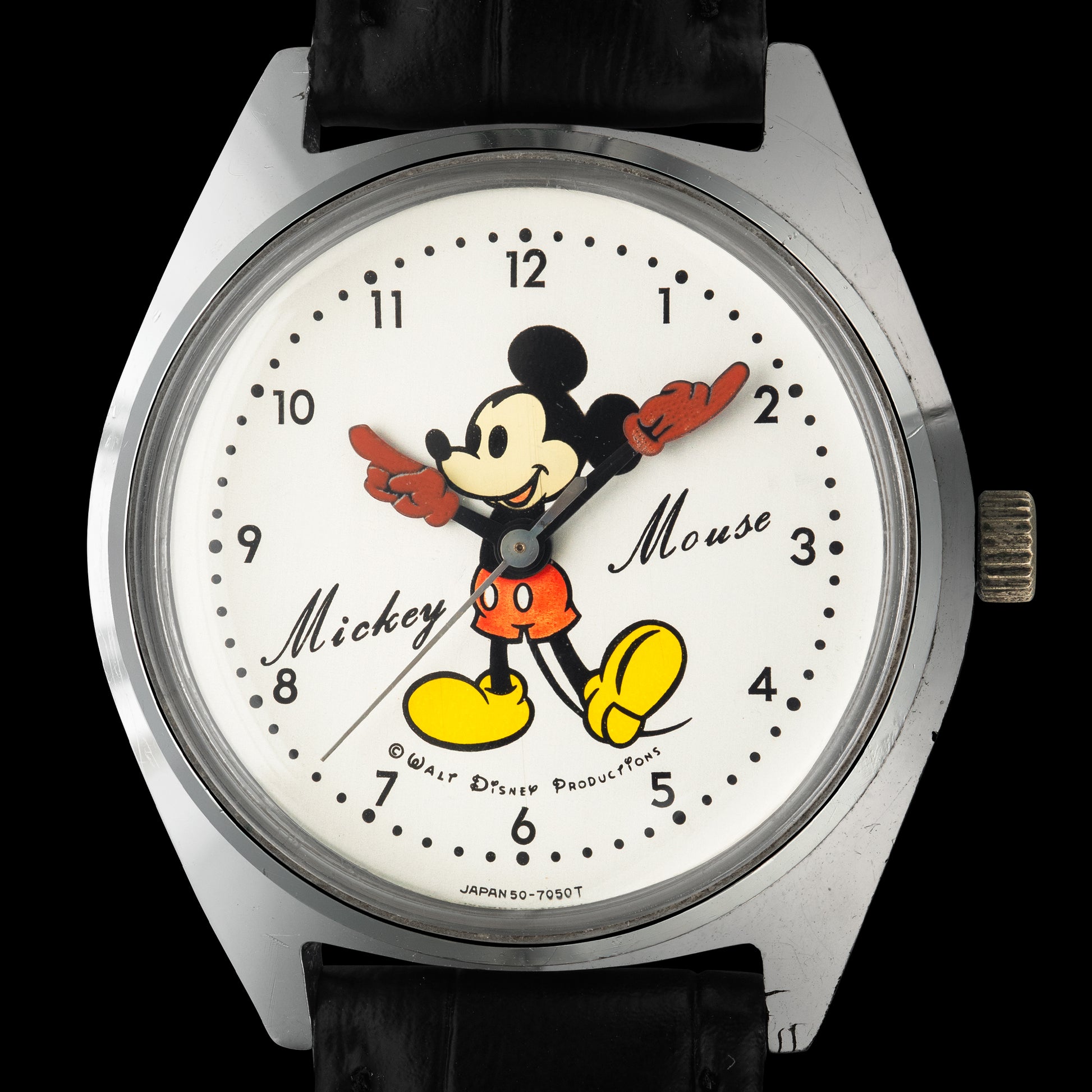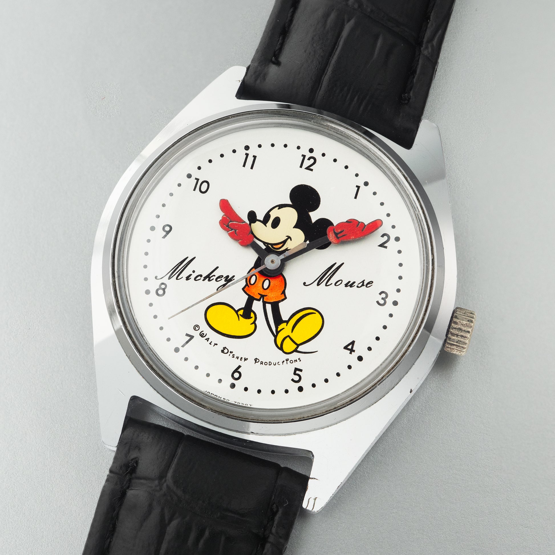 A rare vintage Mickey Mouse manual watch made in Japan by Seiko in the 1970s for the domestic market. It features the classic Mickey design with his arms as the watch hands. This is truly a unique and playful watch that represents a piece of pop culture history.