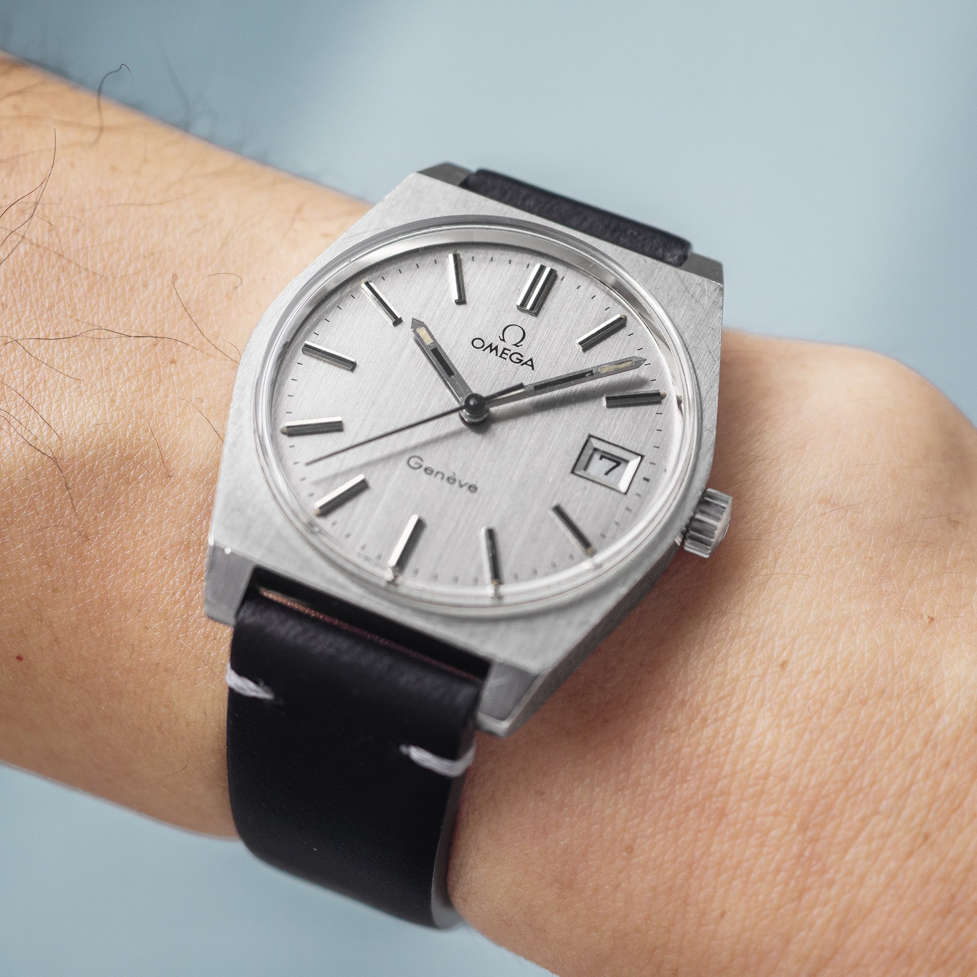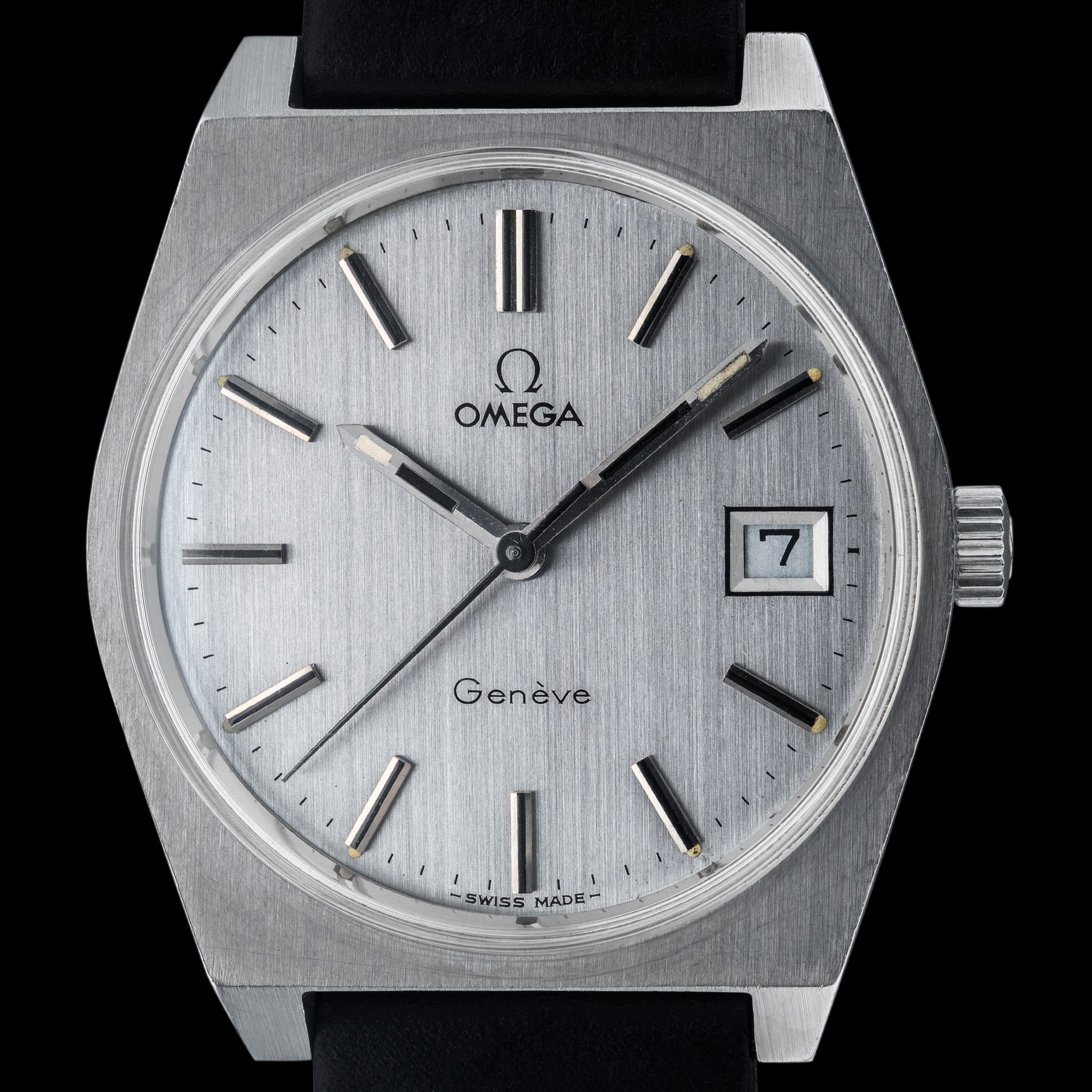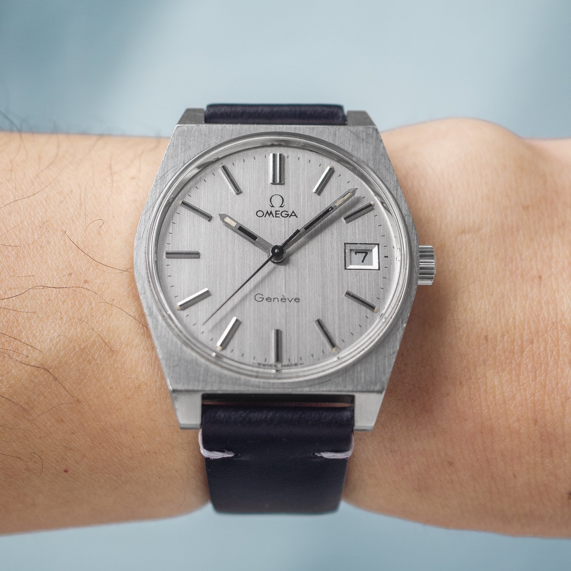 This Omega Genève from 1972 features a grey, vertically brushed dial that catches the light with subtle elegance.