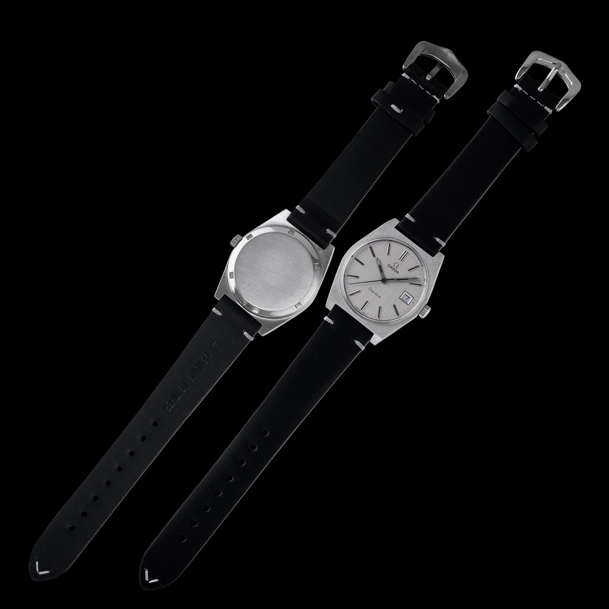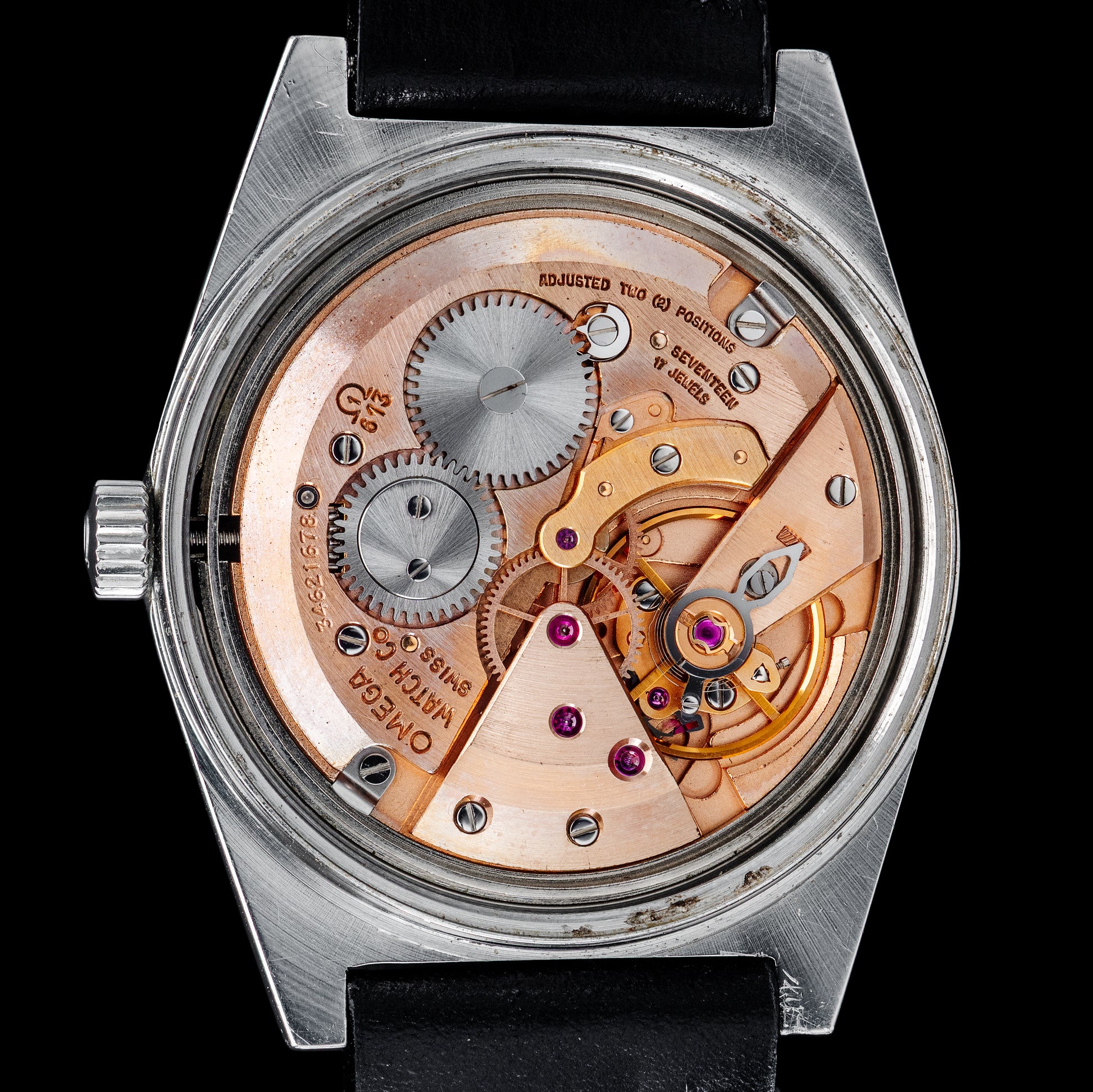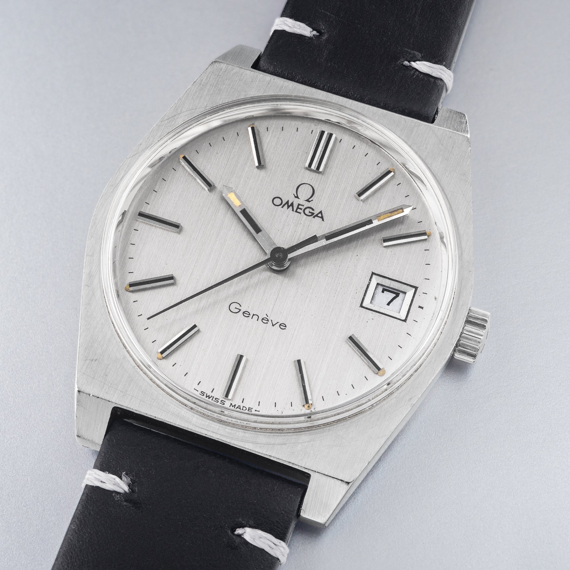 This Omega Genève from 1972 features a grey, vertically brushed dial that catches the light with subtle elegance.