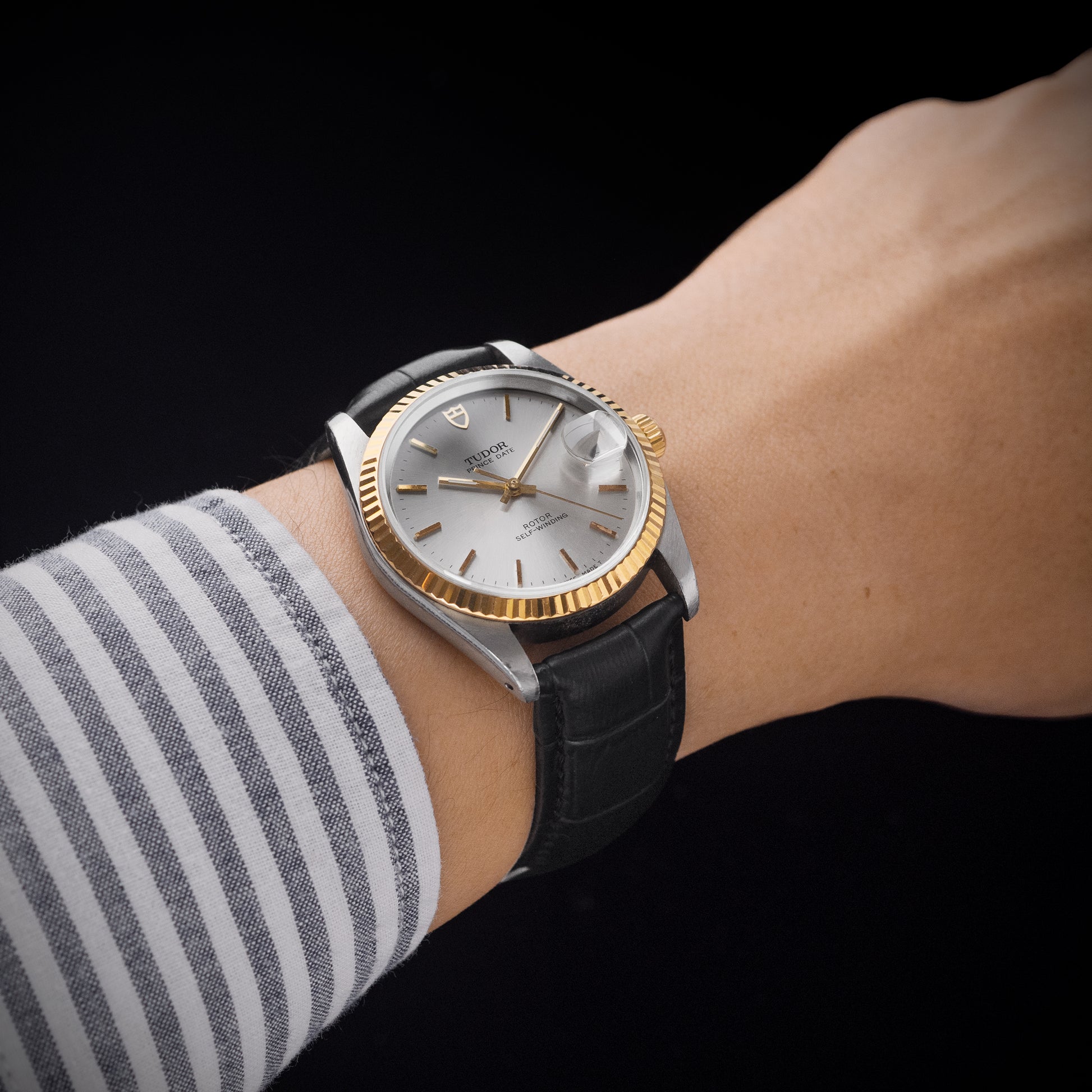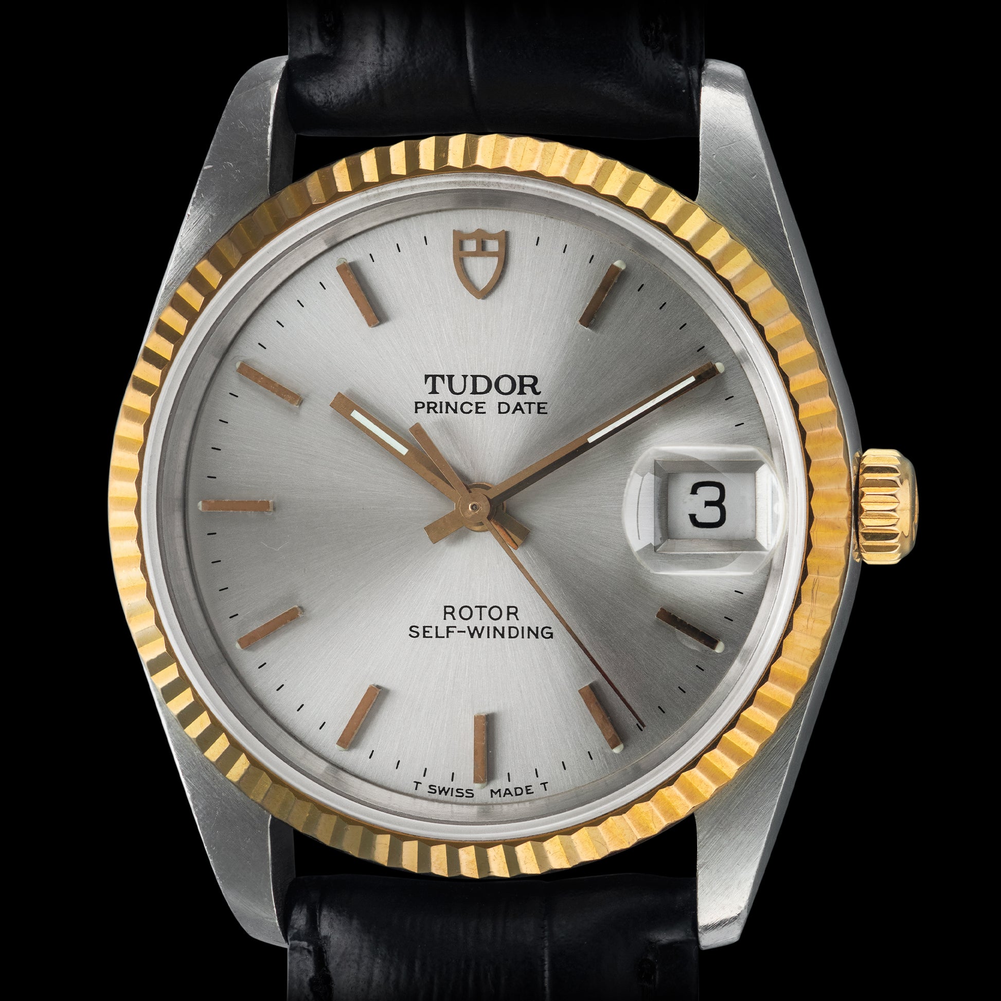 A Tudor Prince Prince Date from 1999 with solid gold bezel and stainless steel case. The Tudor Shield emblem accents the dial with placement at the twelve o clock. It also features a Tudor signed screw down crown and caseback. This is truly a beautiful piece that any watch collector can appreciate.