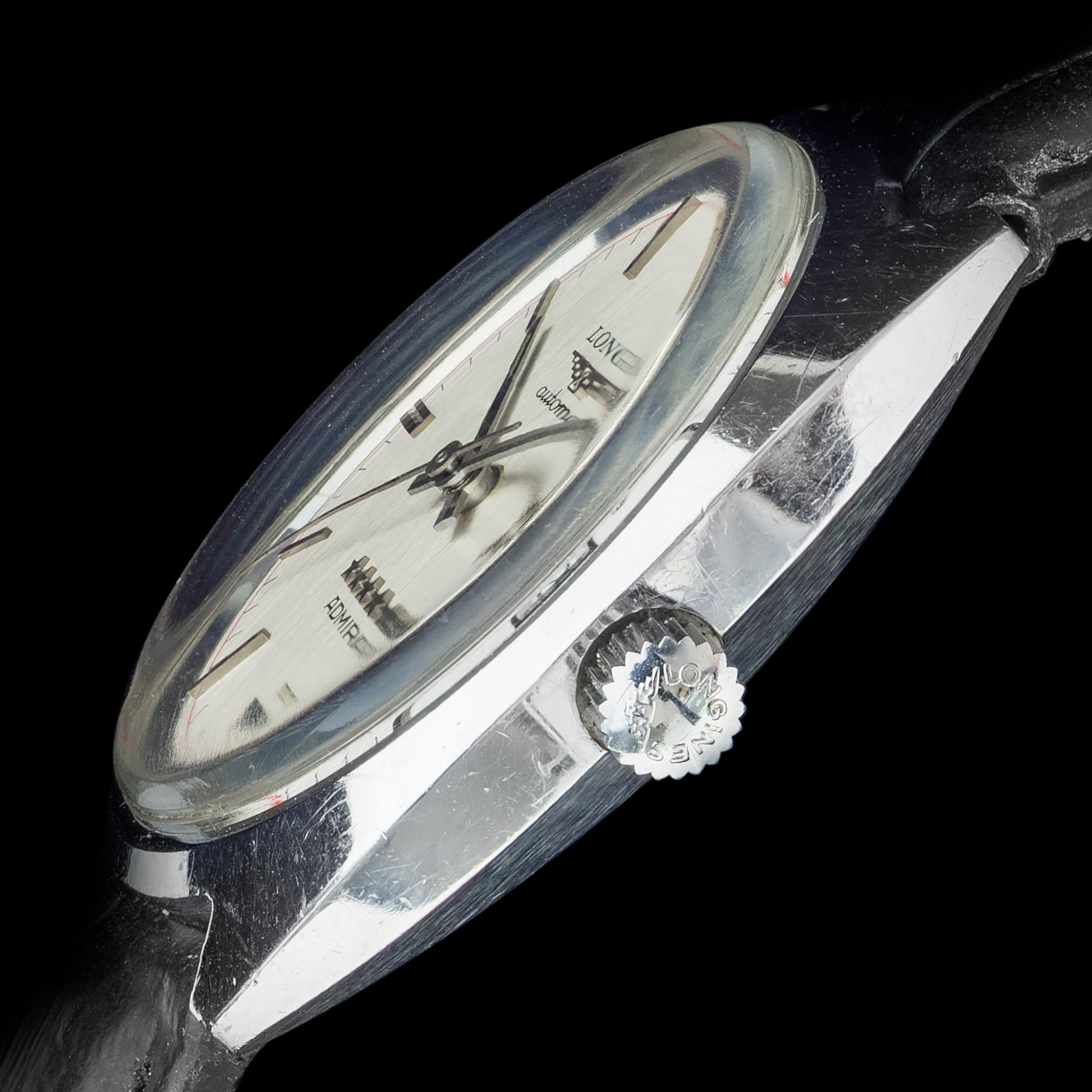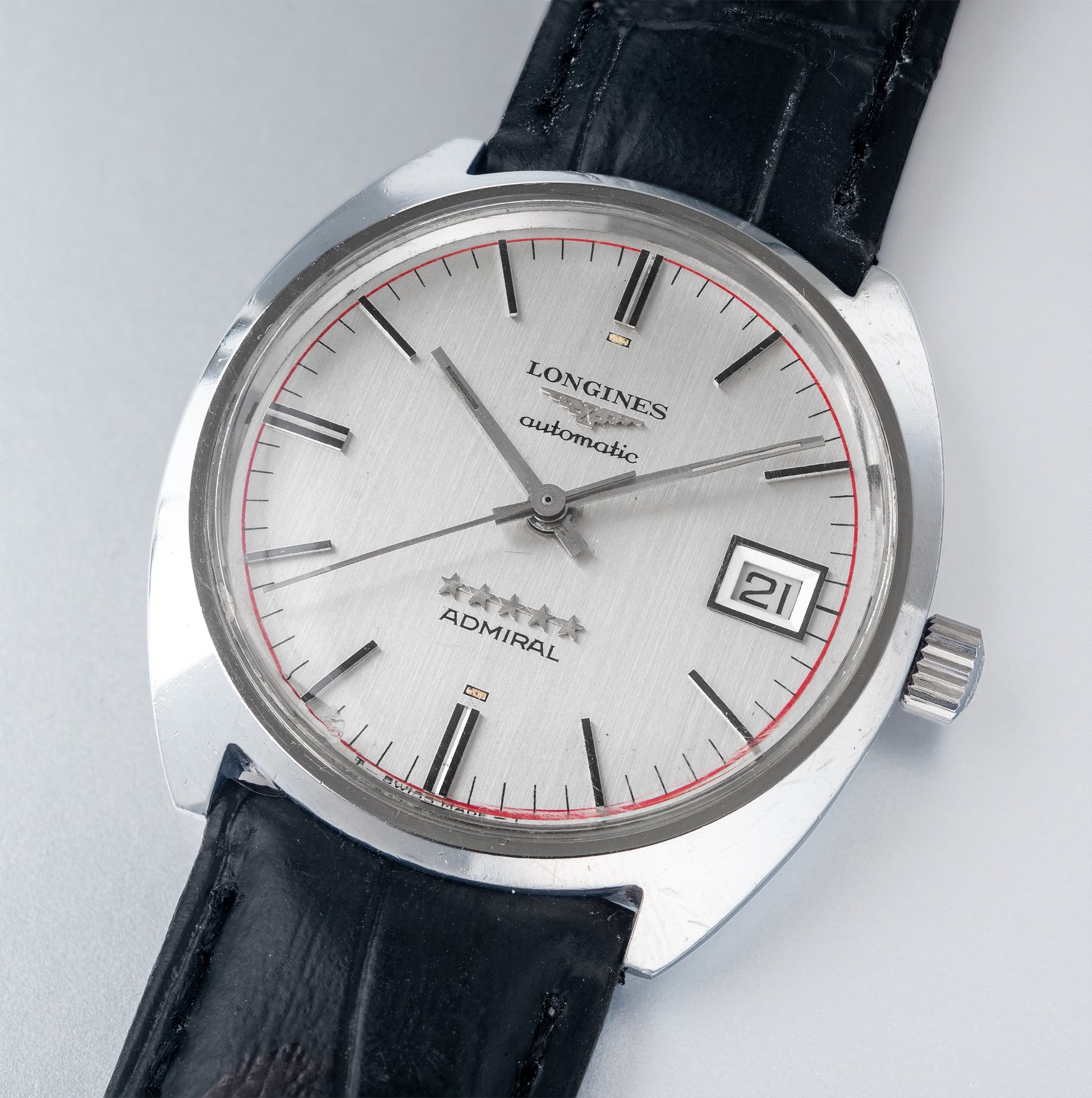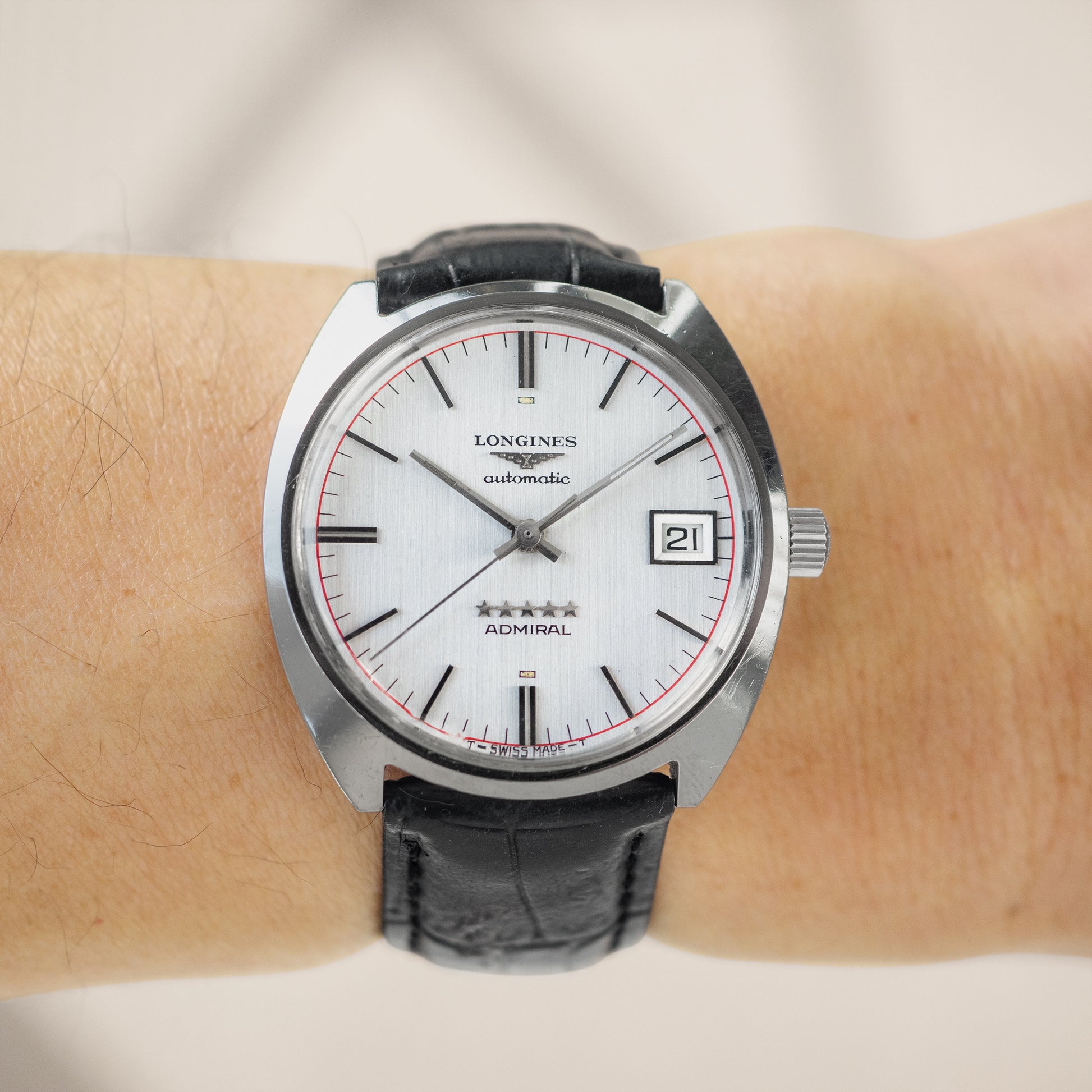 This Longines Admiral 5 Star Automatic from the 1970s features a vertically brushed dial adorned with the iconic winged hourglass logo. It is housed in a stainless steel monocoque case designed to enhance water resistance. The movement includes a unique function: pressing down the crown quickly advances the date. I’m especially fond of the red outline on the dial—it adds a subtle yet striking contrast to the overall design.