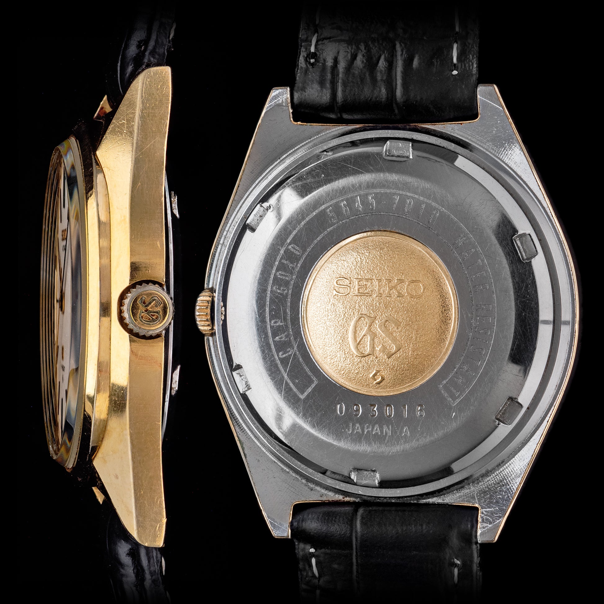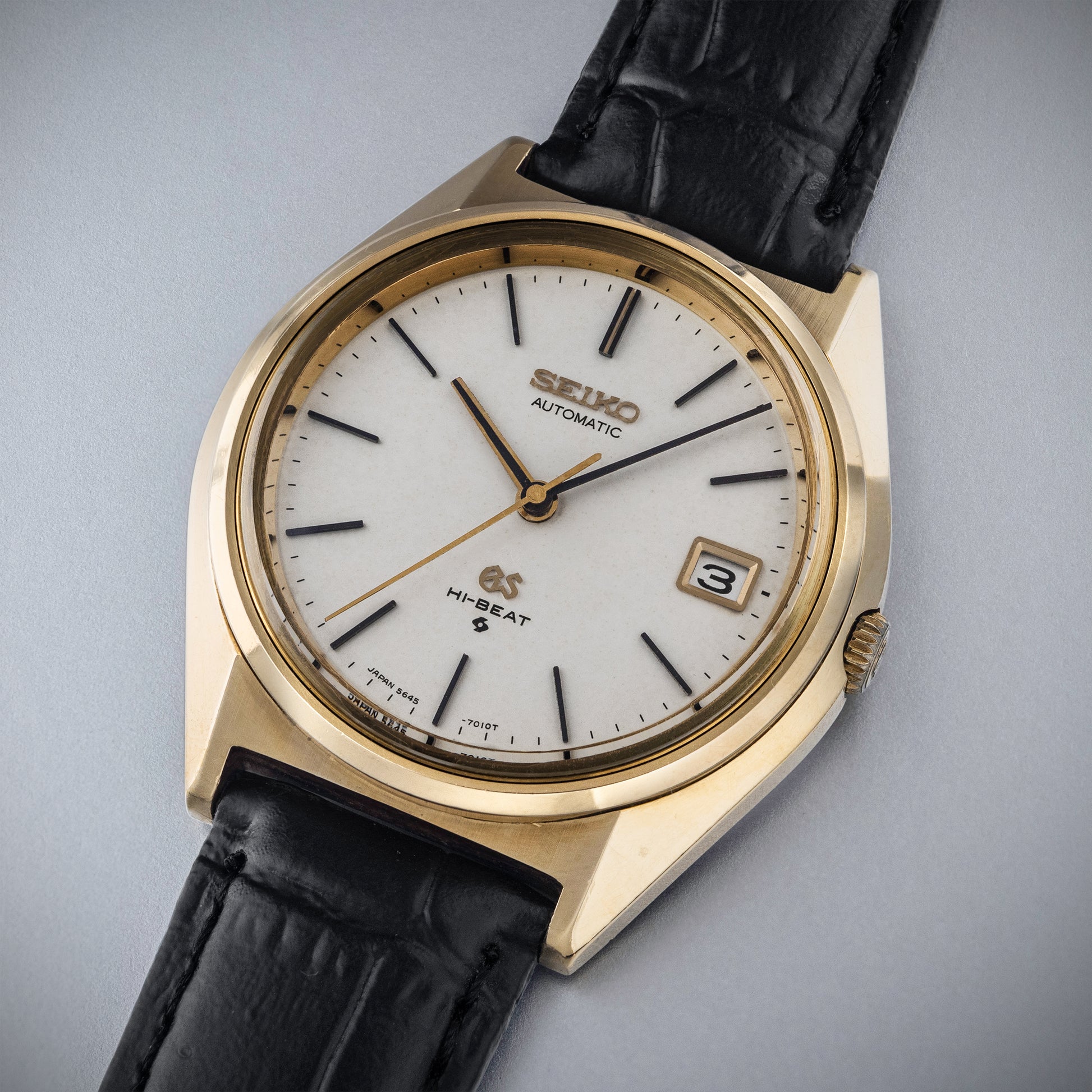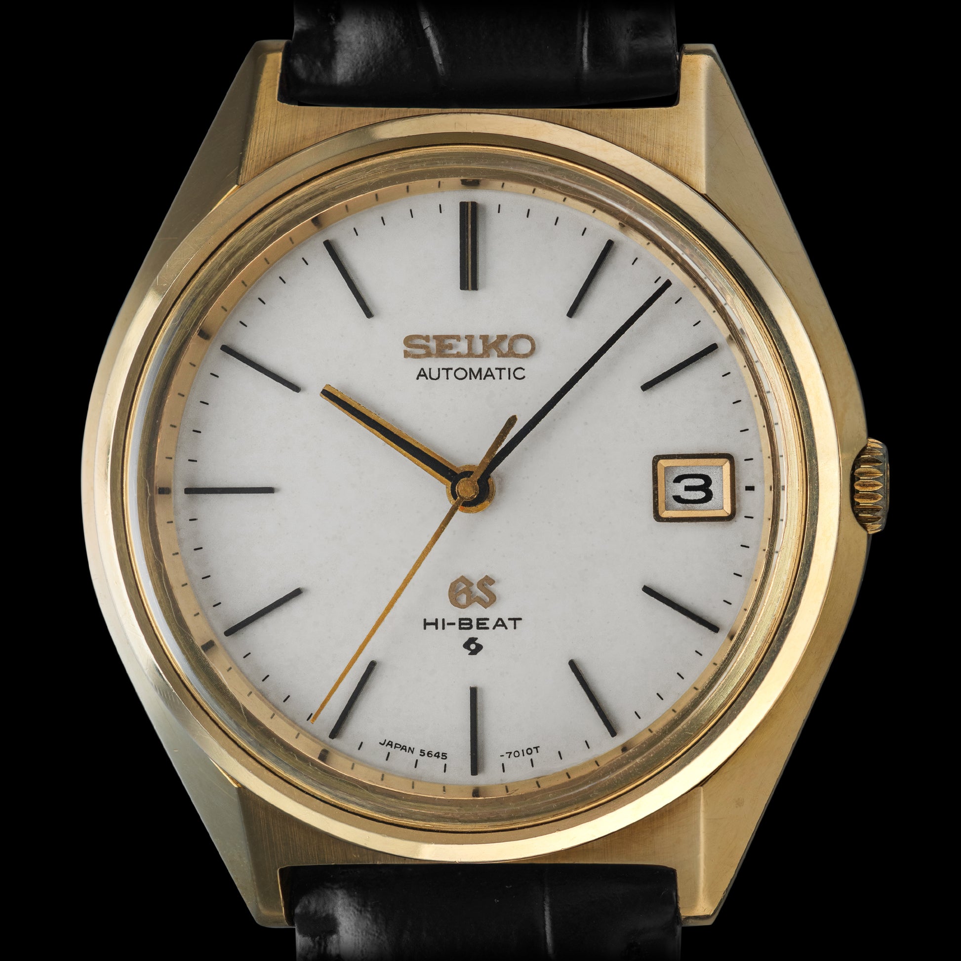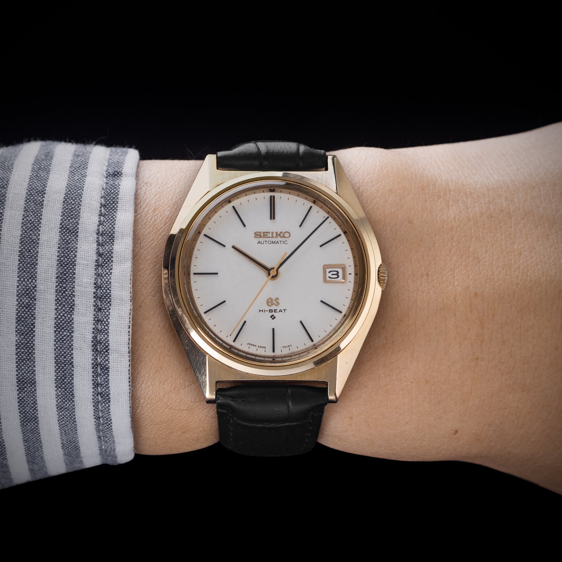 This Grand Seiko 56GS Hi-Beat from 1970 featuring a stunningly beautiful white matte dial and cap gold case. This is truly a beautiful piece that any watch collector can appreciate.