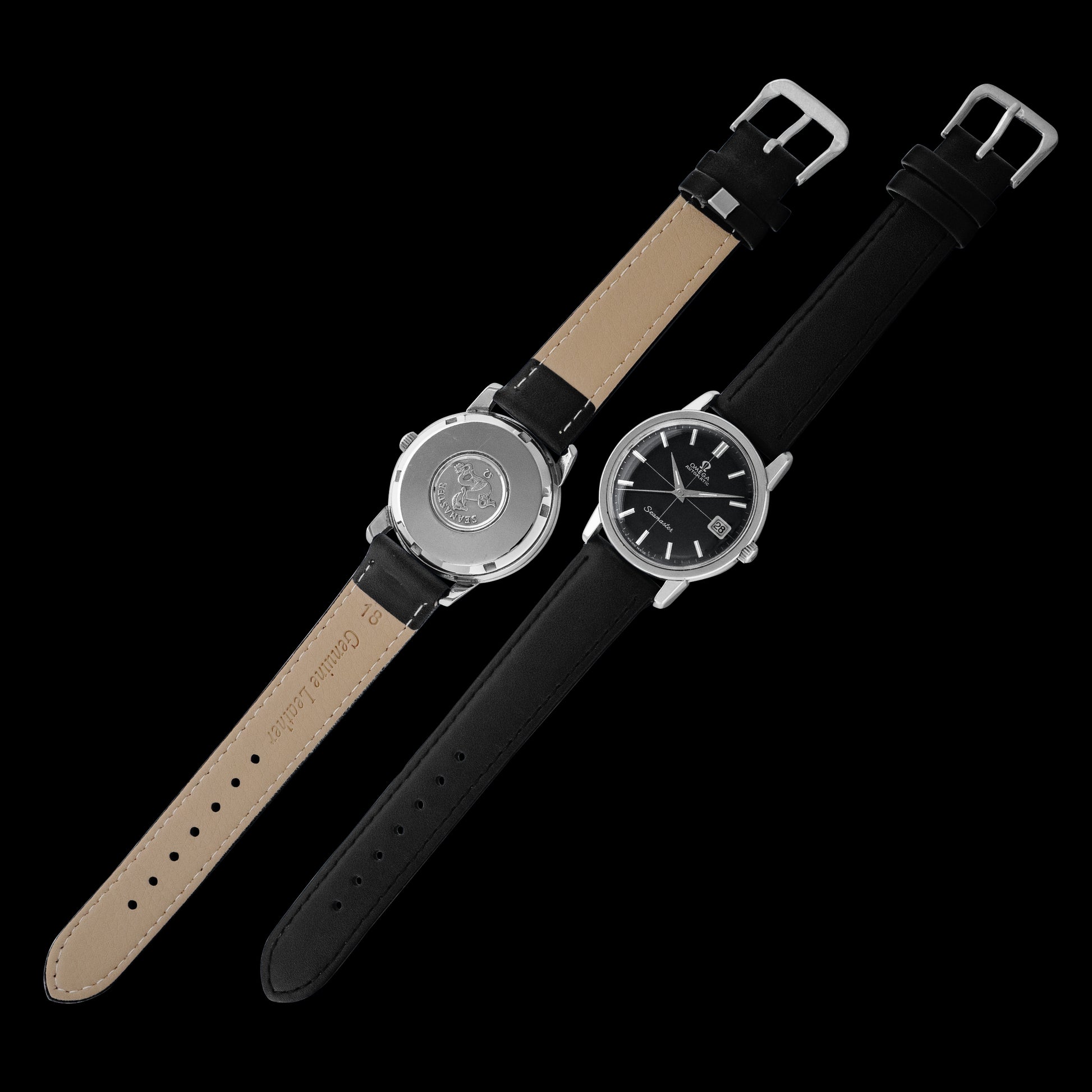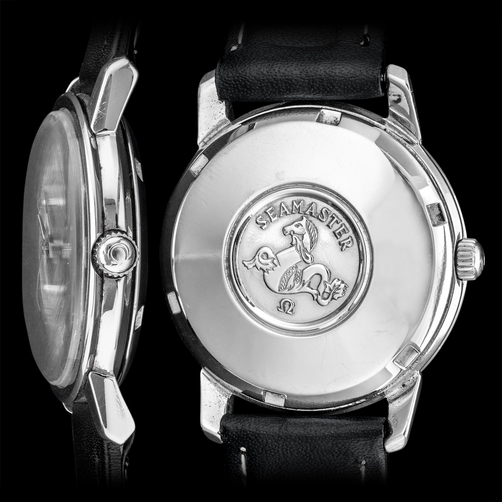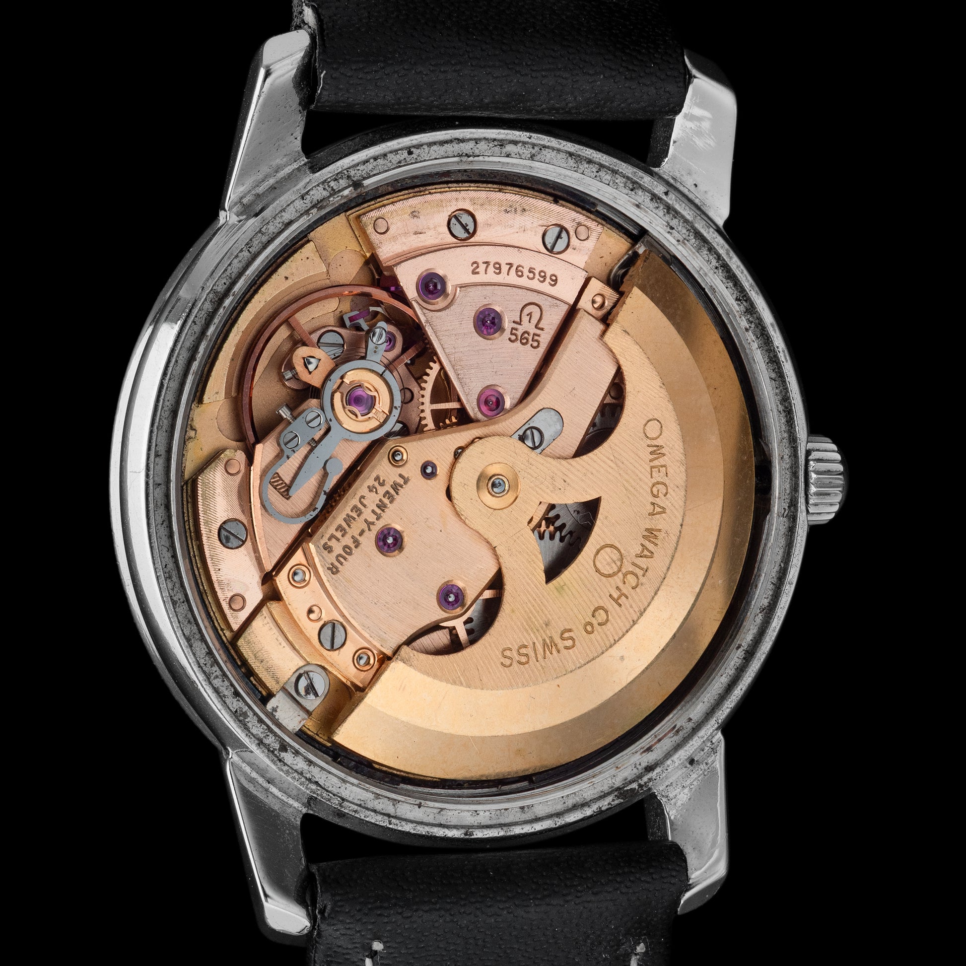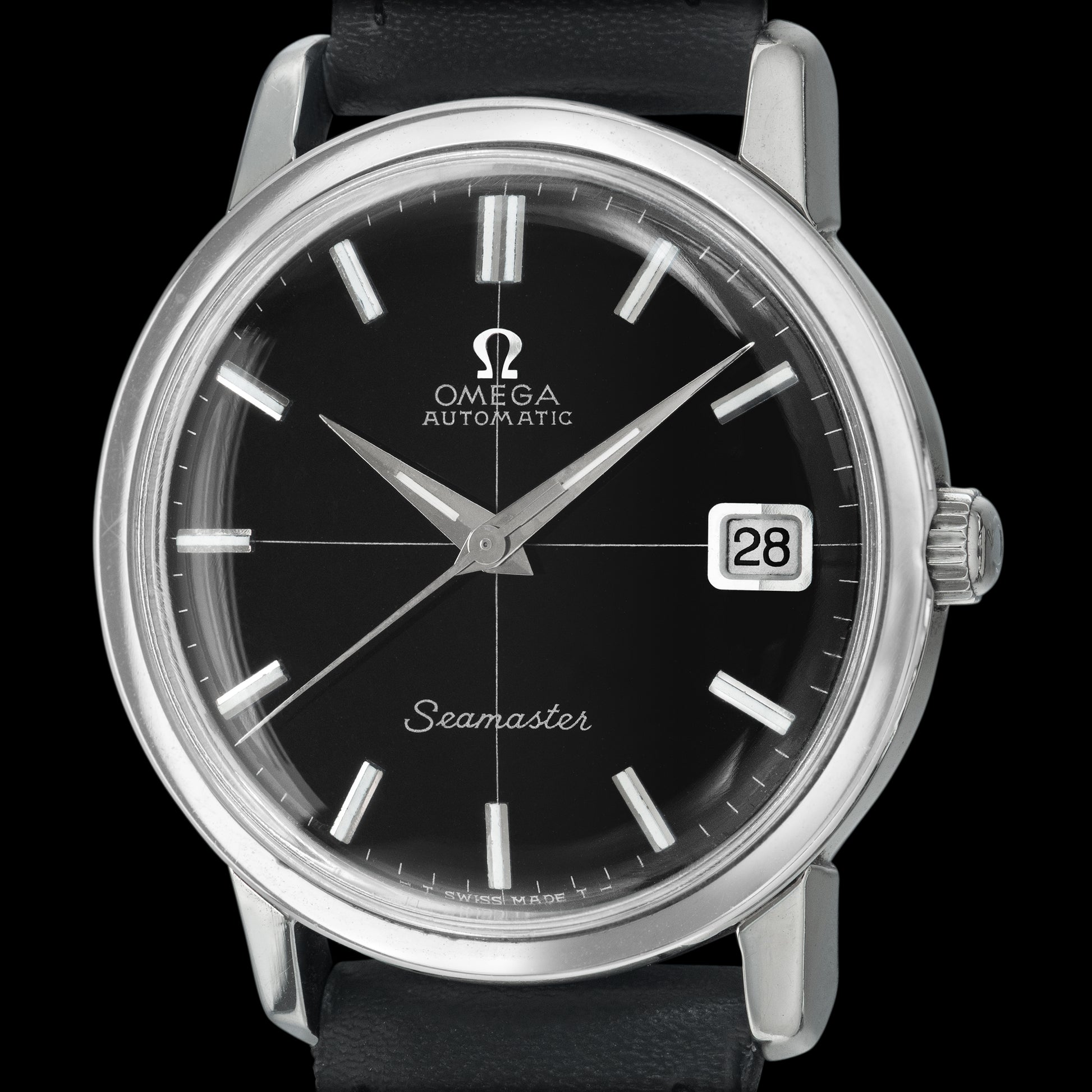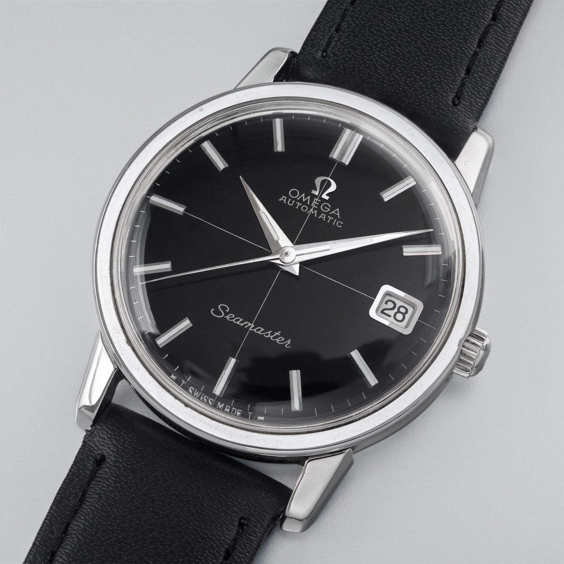 This 1968 Omega Seamaster features a jet-black crosshair dial. It is powered by the Caliber 565 automatic movement, known for its reliability and convenient quick-set date function, which is activated by pulling the crown.