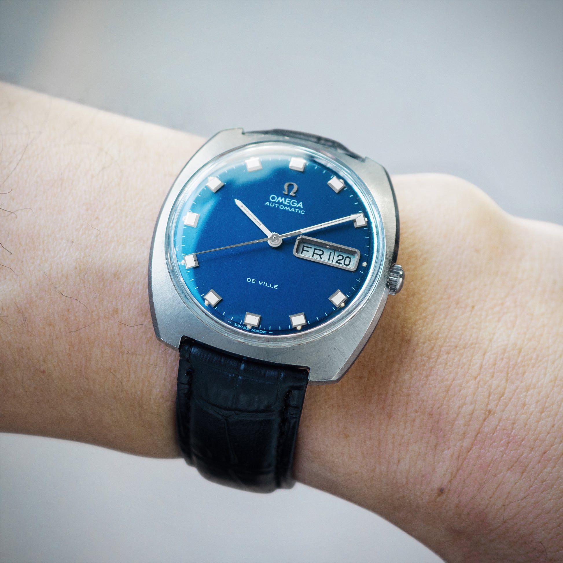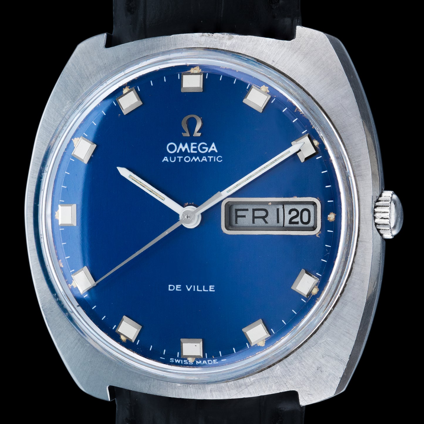 This rare Omega De Ville Day-Date from 1970 features a stunning blue dial with 'De Ville' printed at 6 o'clock. It is housed in a stainless steel monocoque case designed to enhance water resistance. It's a truly beautiful piece that any watch collector can appreciate.