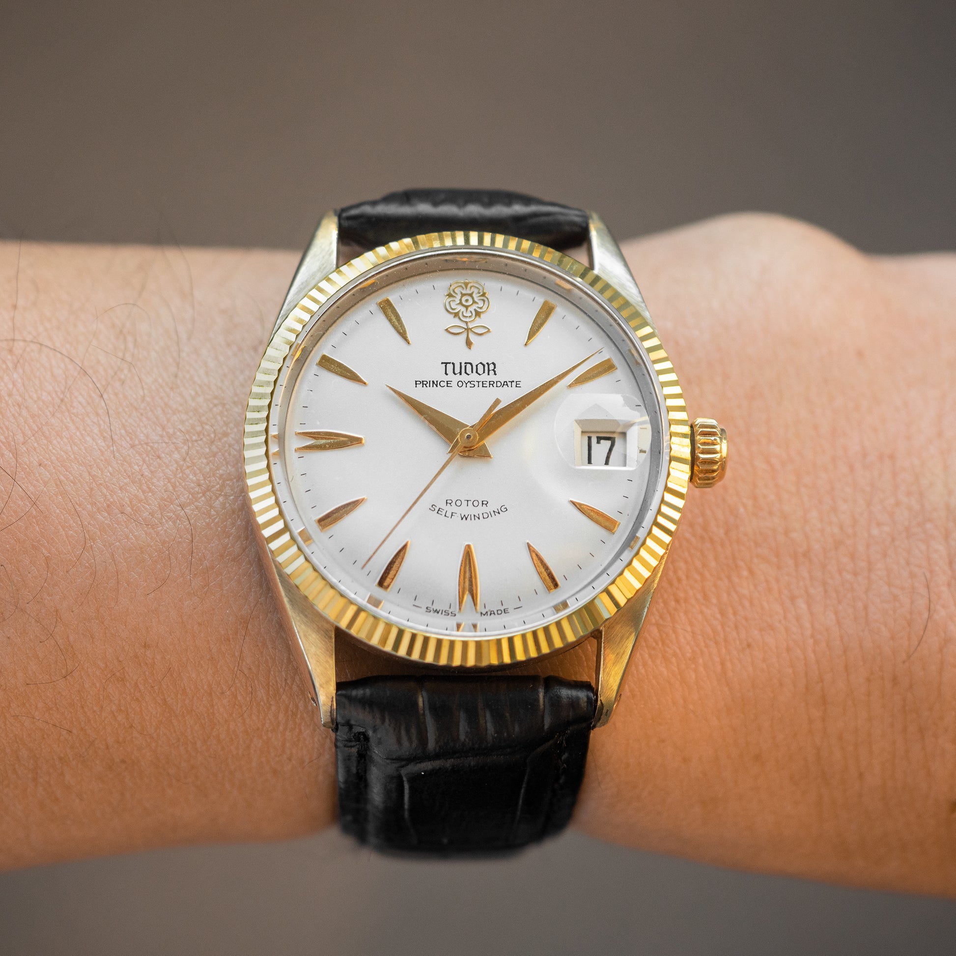This Tudor Oyster Prince Oysterdate Rotor Self-Winding from 1964 features the cult-followed 'Big Rose' logo at 12. It also boasts a capped gold case (second only to a solid gold case) and a solid gold bezel. This is truly a beautiful piece that any watch collector can appreciate.