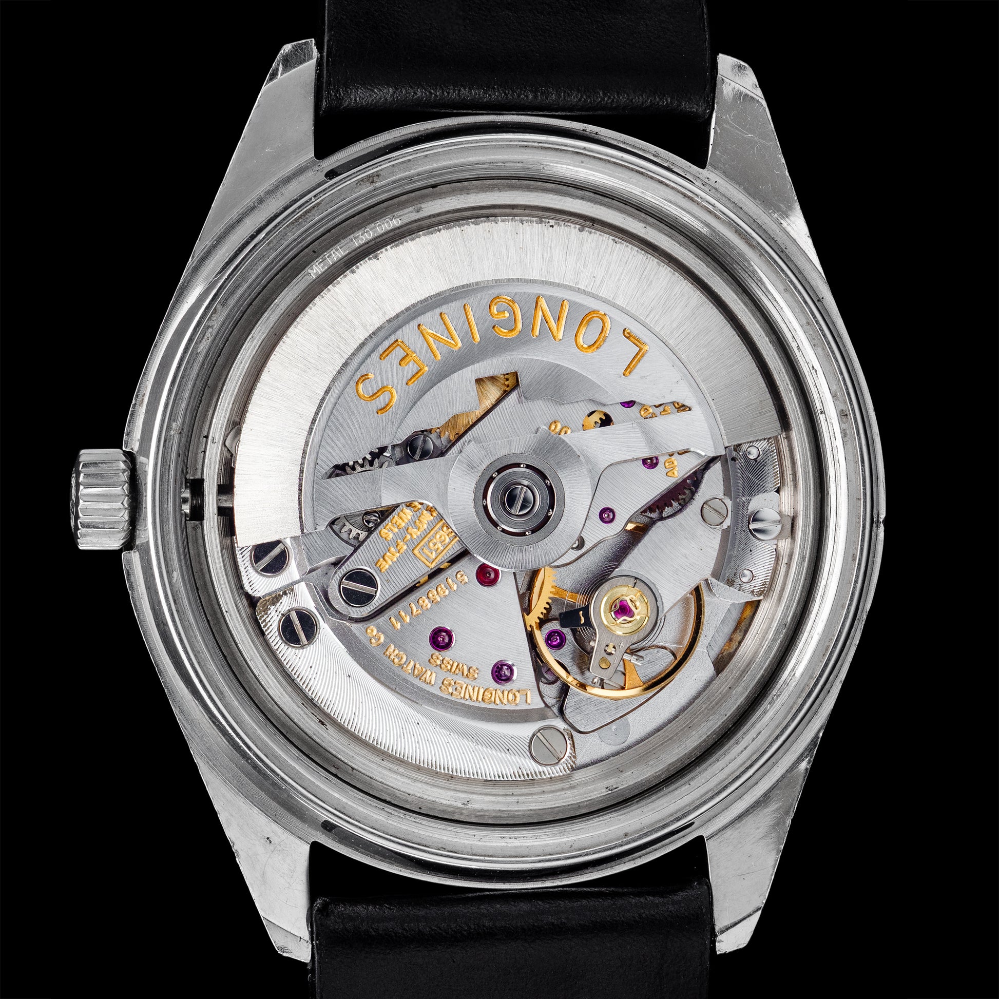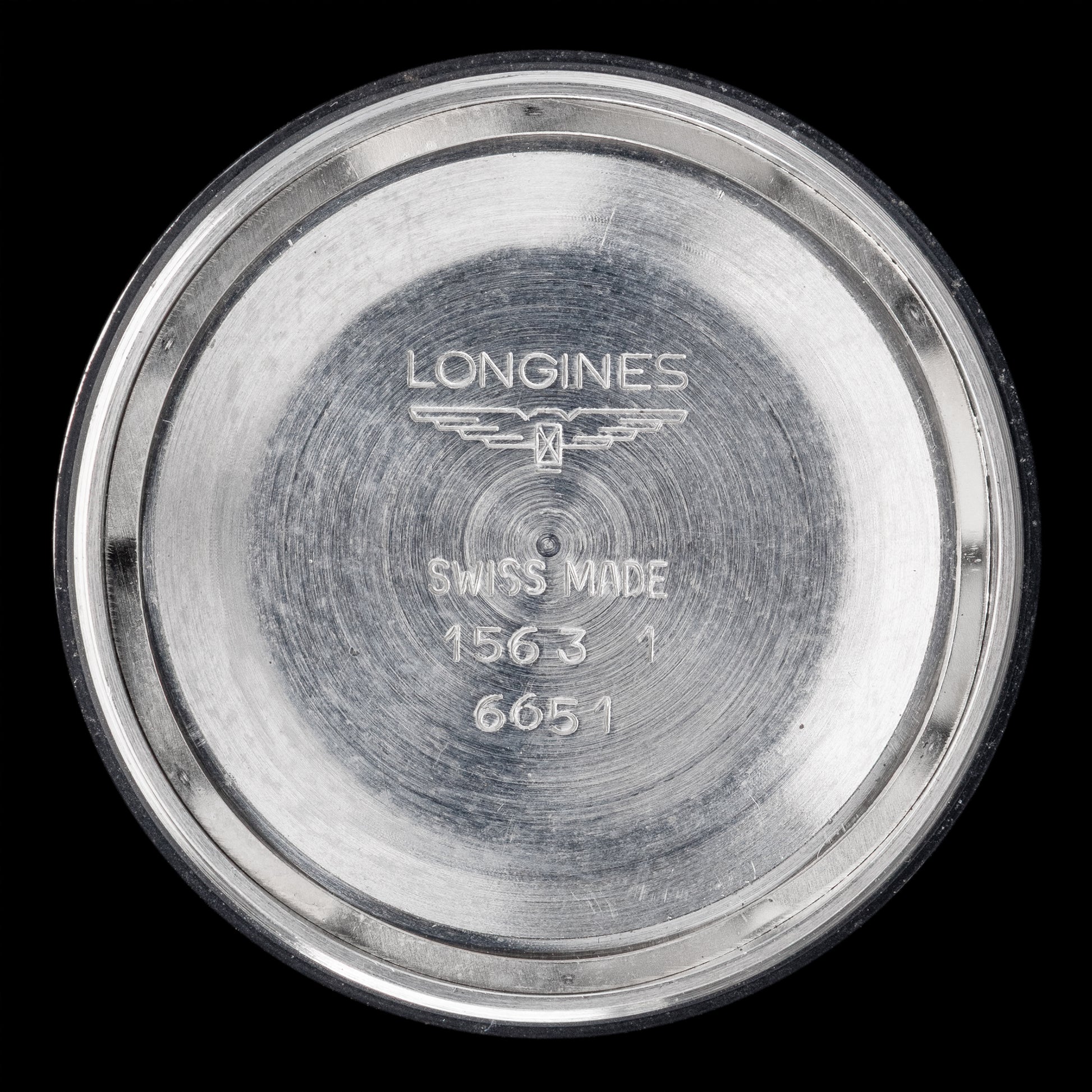 The stainless steel case has a solid, angular design with a screw-down caseback. Inside is the Longines Caliber 6651, a 21,600 vph automatic movement with date function. The date is set by moving the hands back and forth past midnight, a clever mechanism typical of Longines automatics from this era.