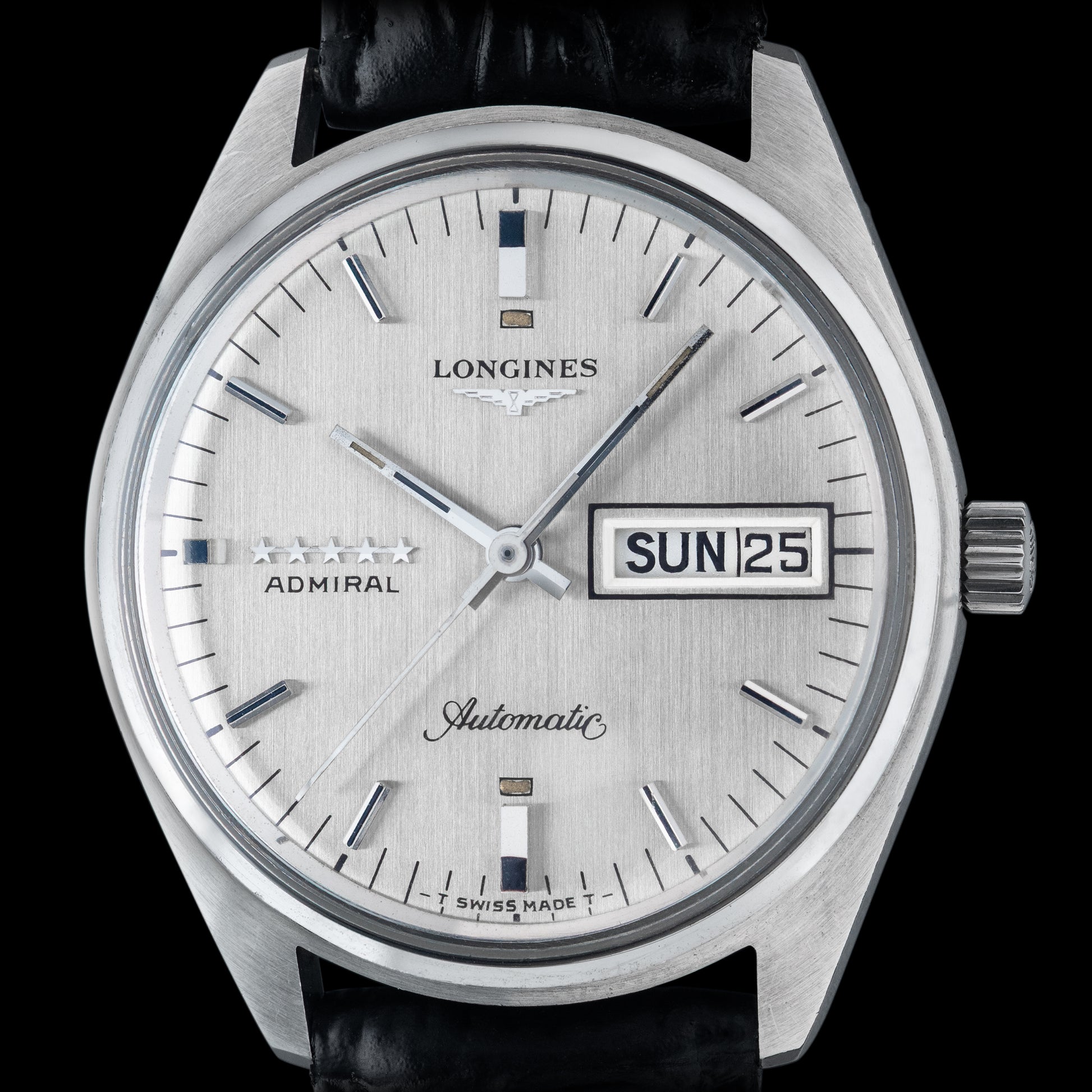 This Longines Admiral 5 Star Automatic from 1974 features a vertically brushed silver dial adorned with the iconic winged hourglass logo and five applied stars—a hallmark of the Admiral series that signifies enhanced durability and superior movement quality. The layout is clean and purposeful, with baton hour markers and matching baton hands that give the watch a sharp, elegant presence.
