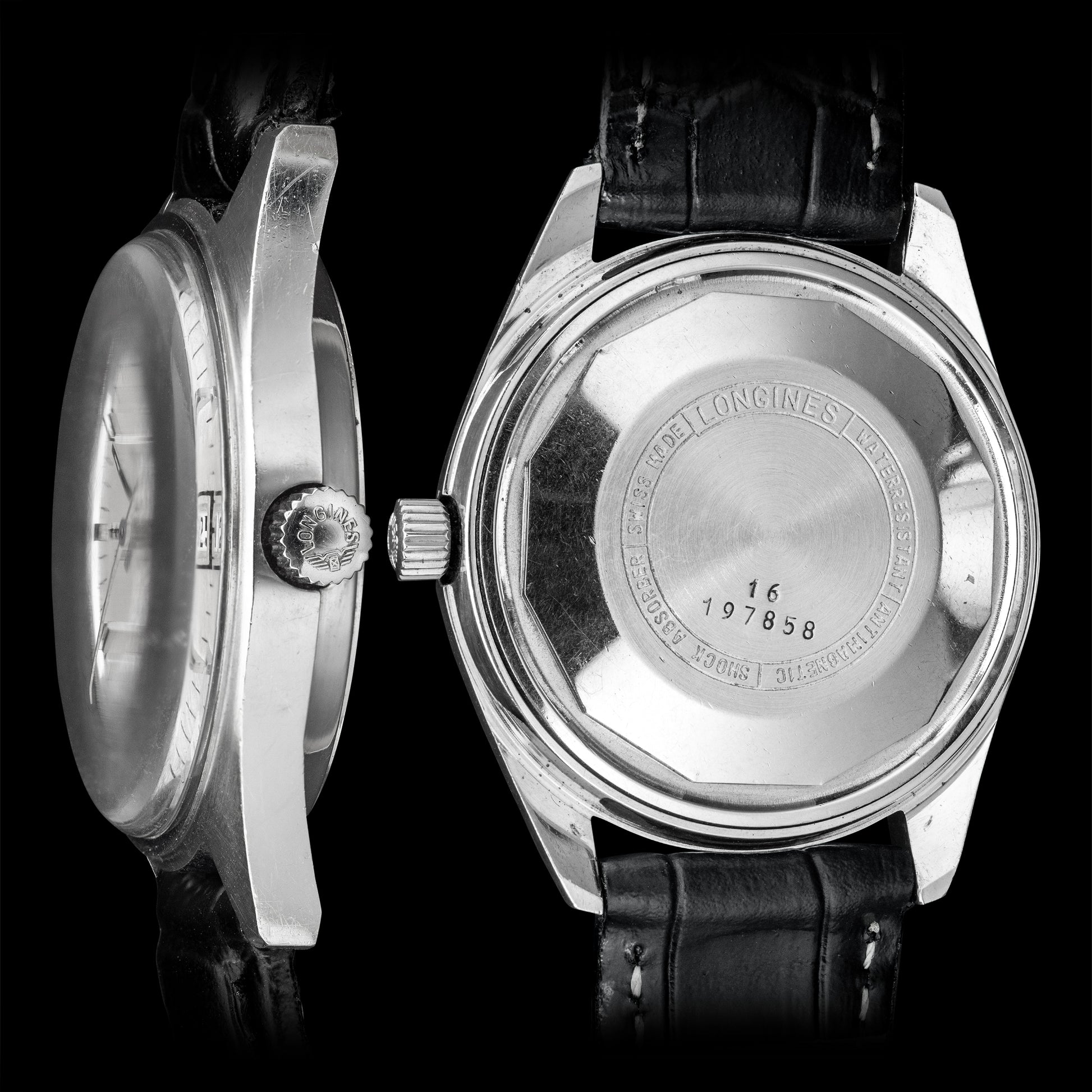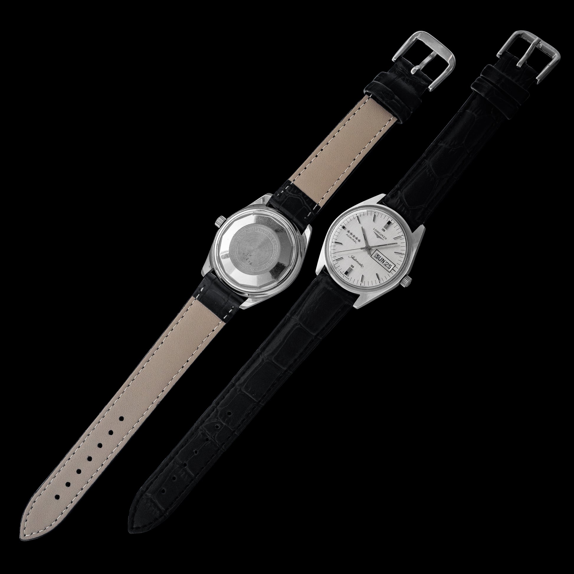 The stainless-steel case has a solid, angular design with circular brushing throughout. Inside is the Longines Caliber 508, equipped with a day-date function. The date is set by moving the hands back and forth across midnight—a clever mechanism typical of Longines automatics from this era.