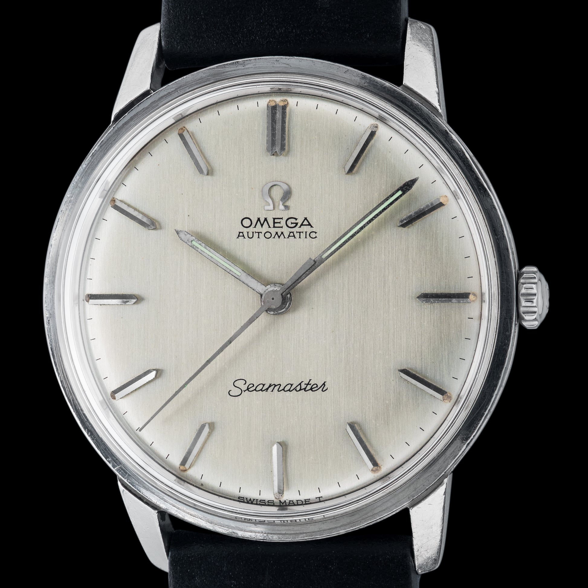 This 1966 Omega Seamaster features a finely executed vertical brushed dial. It is powered by the Caliber 552 automatic movement, known for its reliability.