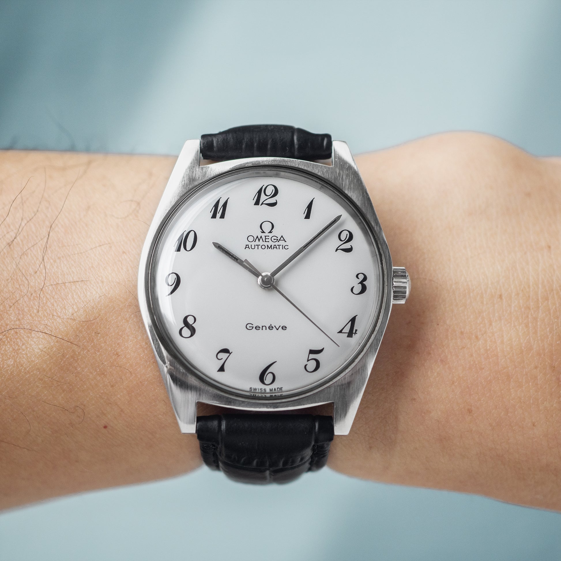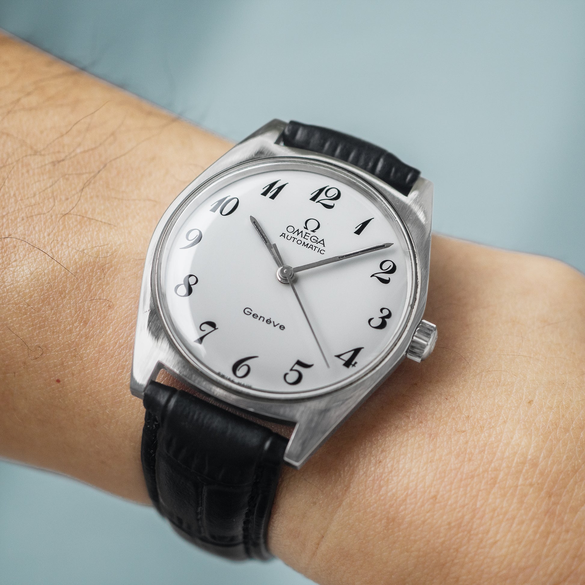 This Omega Genève from 1969 features a rare full-numeral white dial—an uncommon and visually distinctive design that stands out from the more typical dial configurations of the era. The clean, well-balanced layout paired with its vintage charm gives the watch a unique character, making it especially appealing to collectors. Beyond its aesthetics, this piece also represents an interesting chapter in Omega’s history, offering both style and substance for those who appreciate understated yet unusual vintage designs.