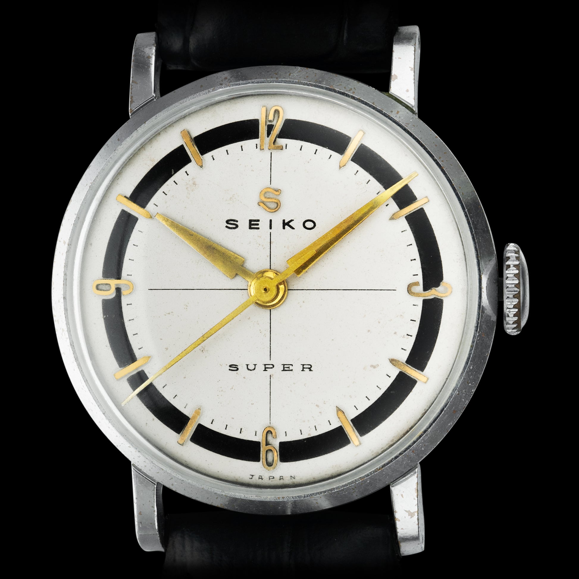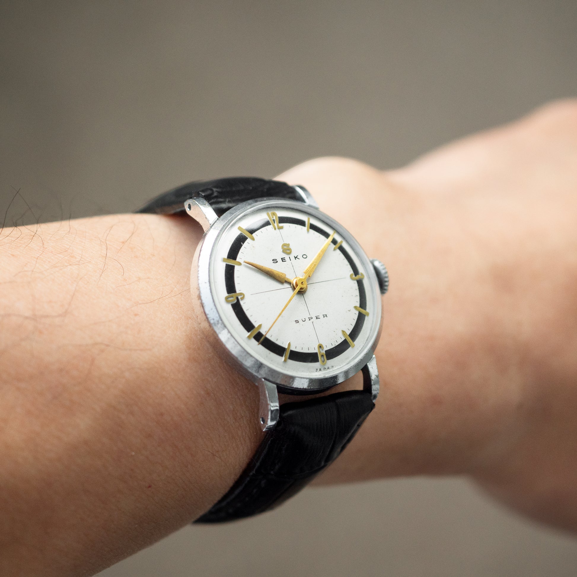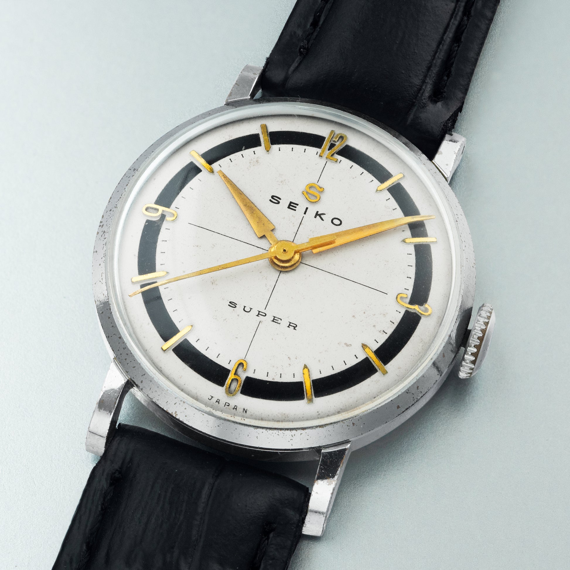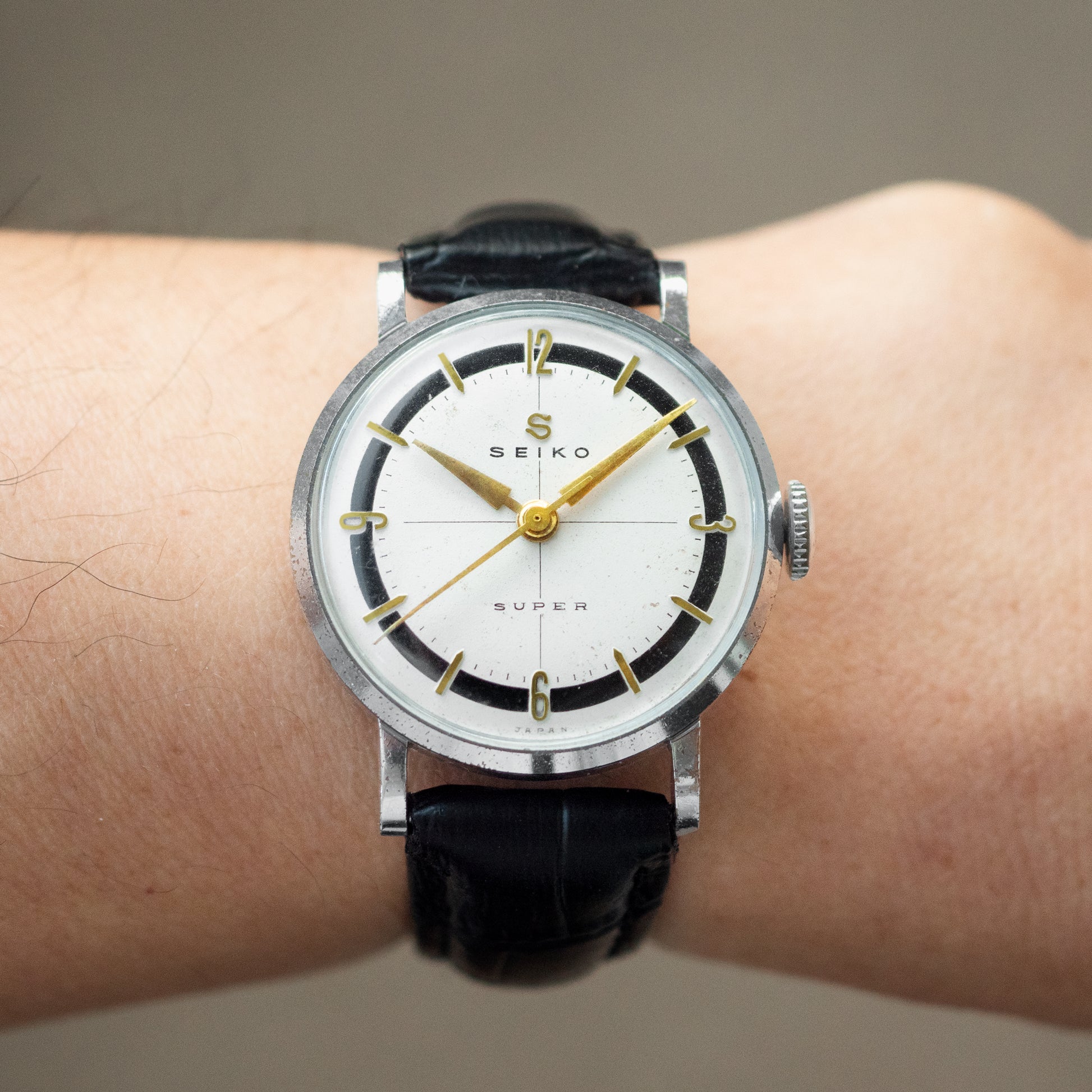 Seiko Super manual winding watch from 1959. It is rare to find a Seiko from that era in such condition, considering the humid climate of Japan (where air conditioning was not popular until the 1970s). The crosshair panda-colored explorer dial is a real beauty to see in person. This is truly a beautiful piece that any watch collector can appreciate.