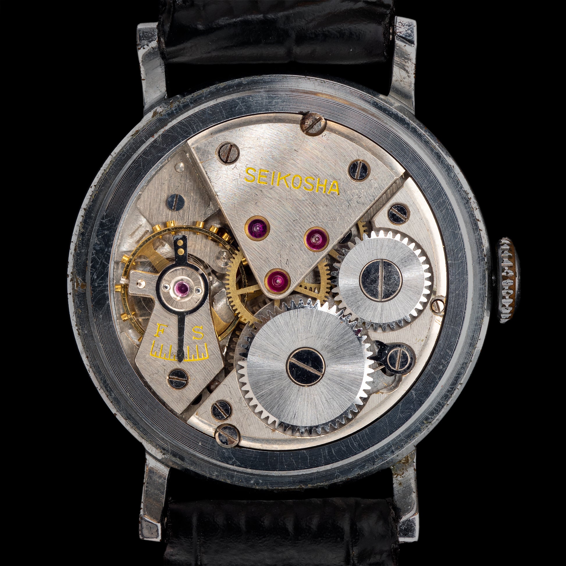 The first wrist watch model of Seiko with a center-second hand mounted concentrically along with the minute and hour hands. Earlier Seiko watches were designed with a small second hand located at the 6 o'clock position.
