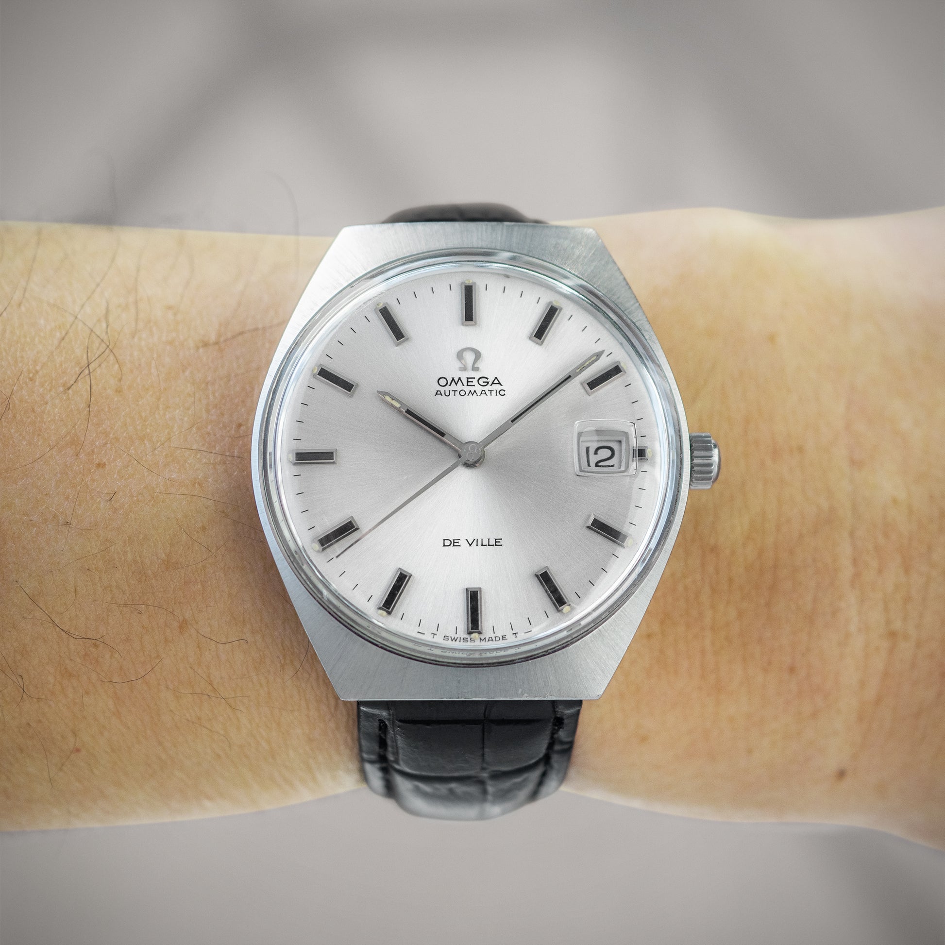 This rare Omega De Ville from 1969 features a stunning sunburst dial with 'De Ville' printed at 6 o'clock. It is housed in a stainless steel monocoque case designed to enhance water resistance. It's a truly beautiful piece that any watch collector can appreciate.