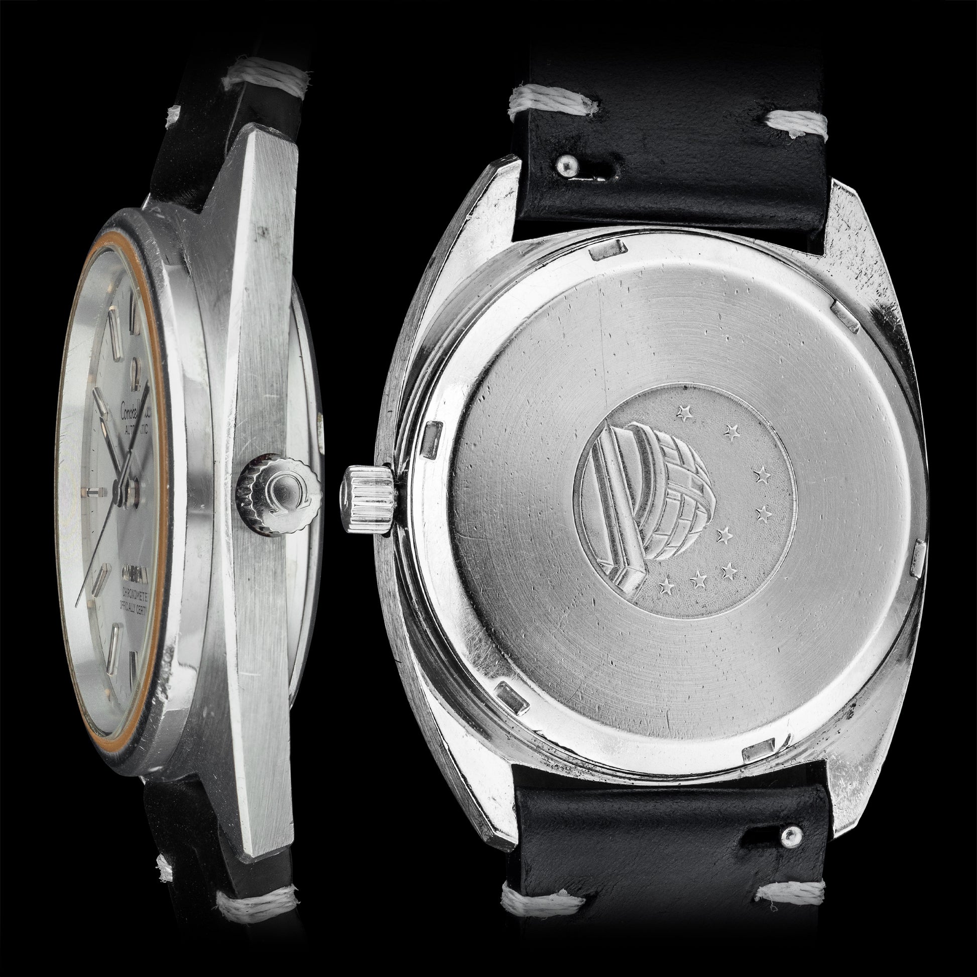 This Omega Constellation Chronometer C-Line from 1973 features a finely executed vertical brushed dial. It is powered by the Caliber 1011 automatic movement, known for its reliability and convenient quick-set function, which allows the date to be adjusted by turning the crown.