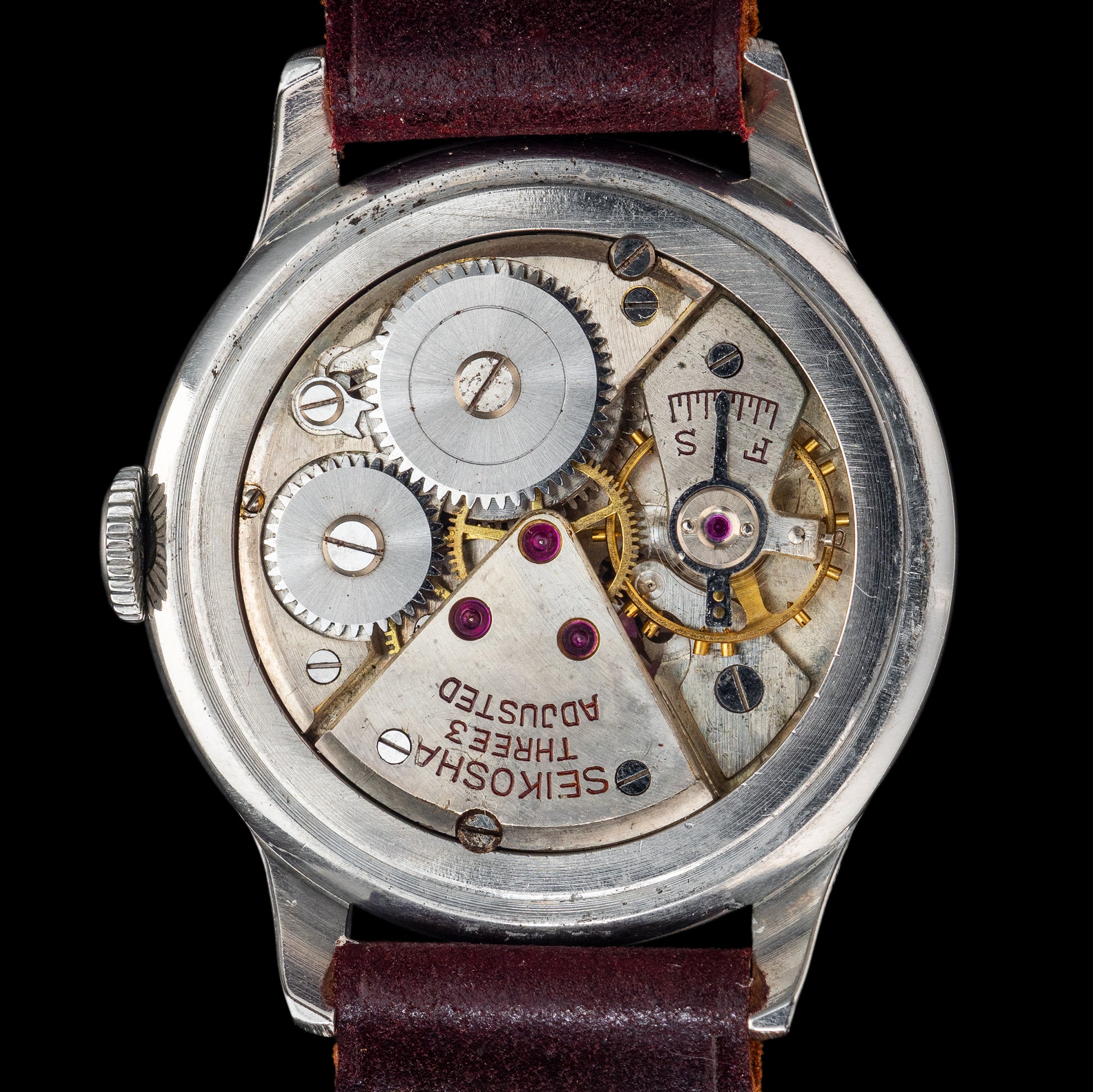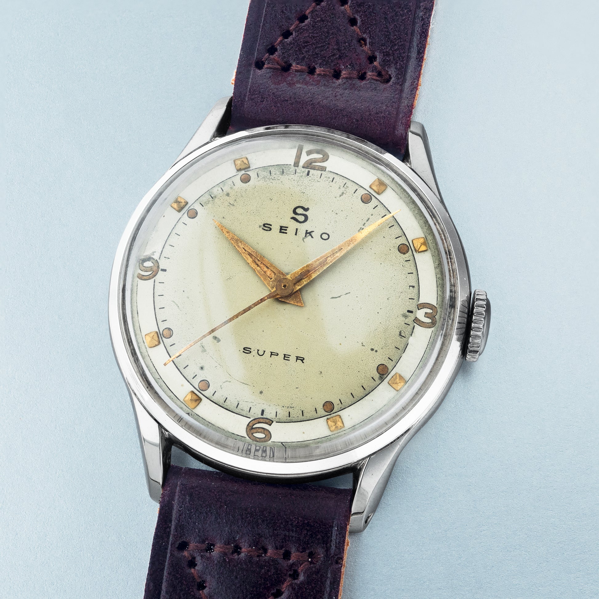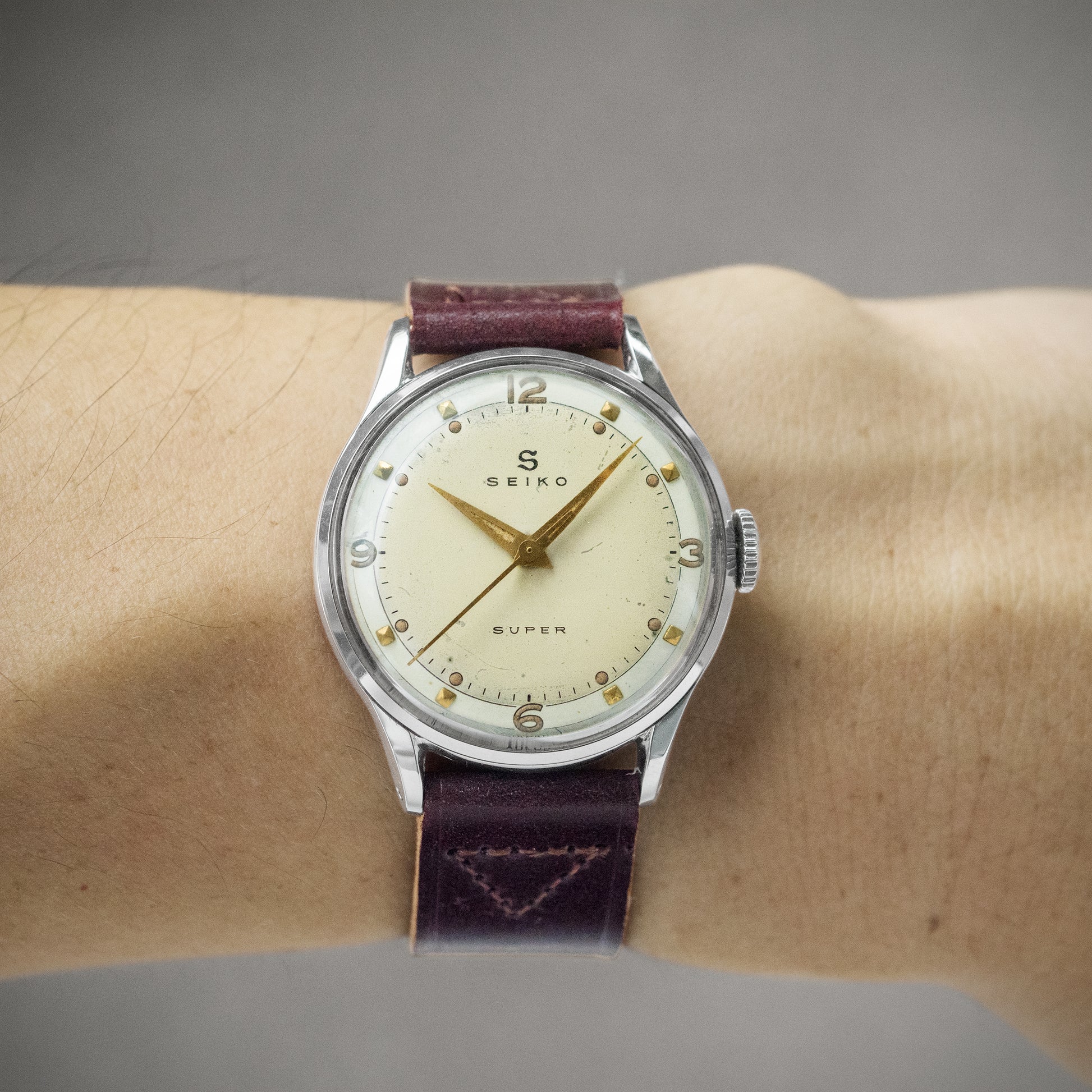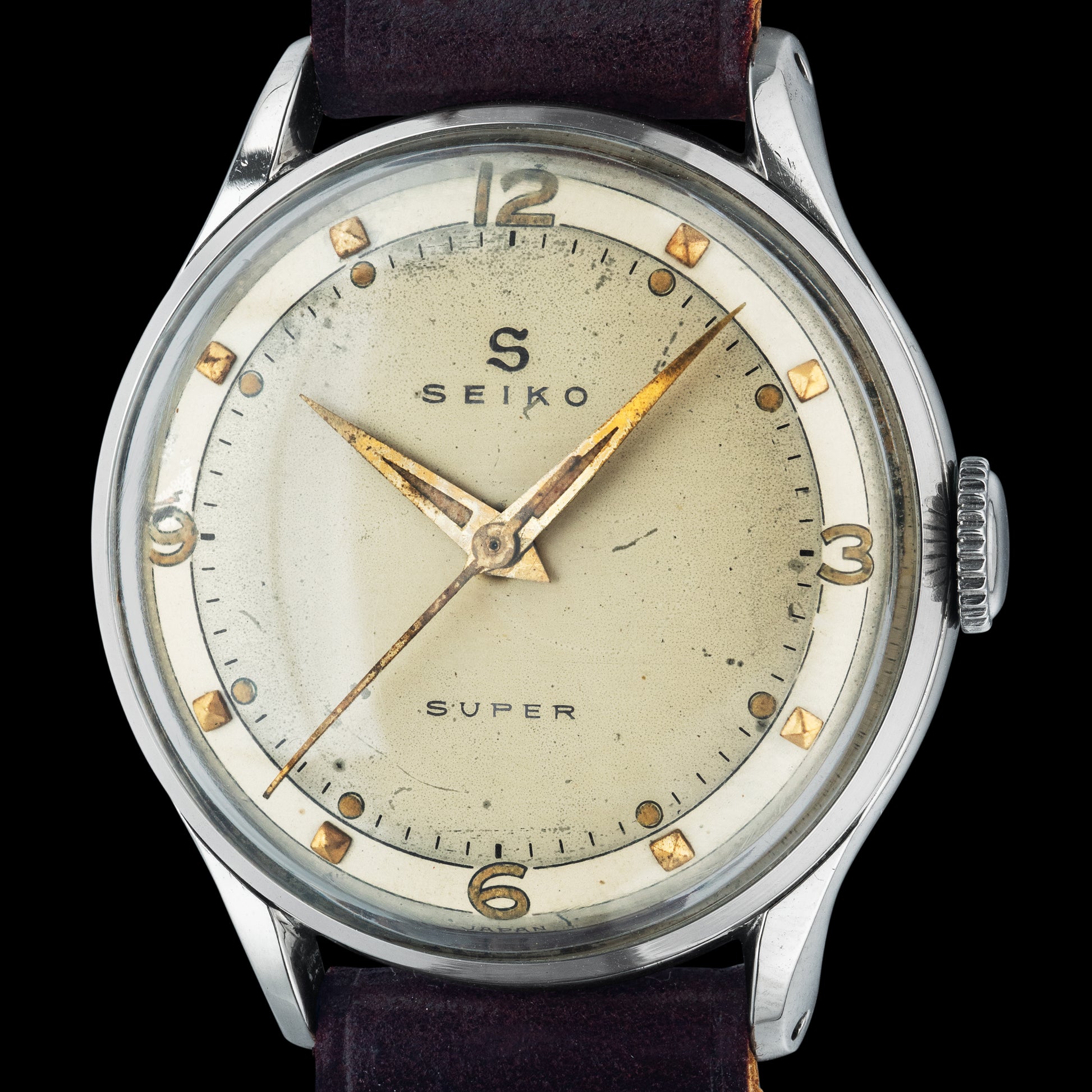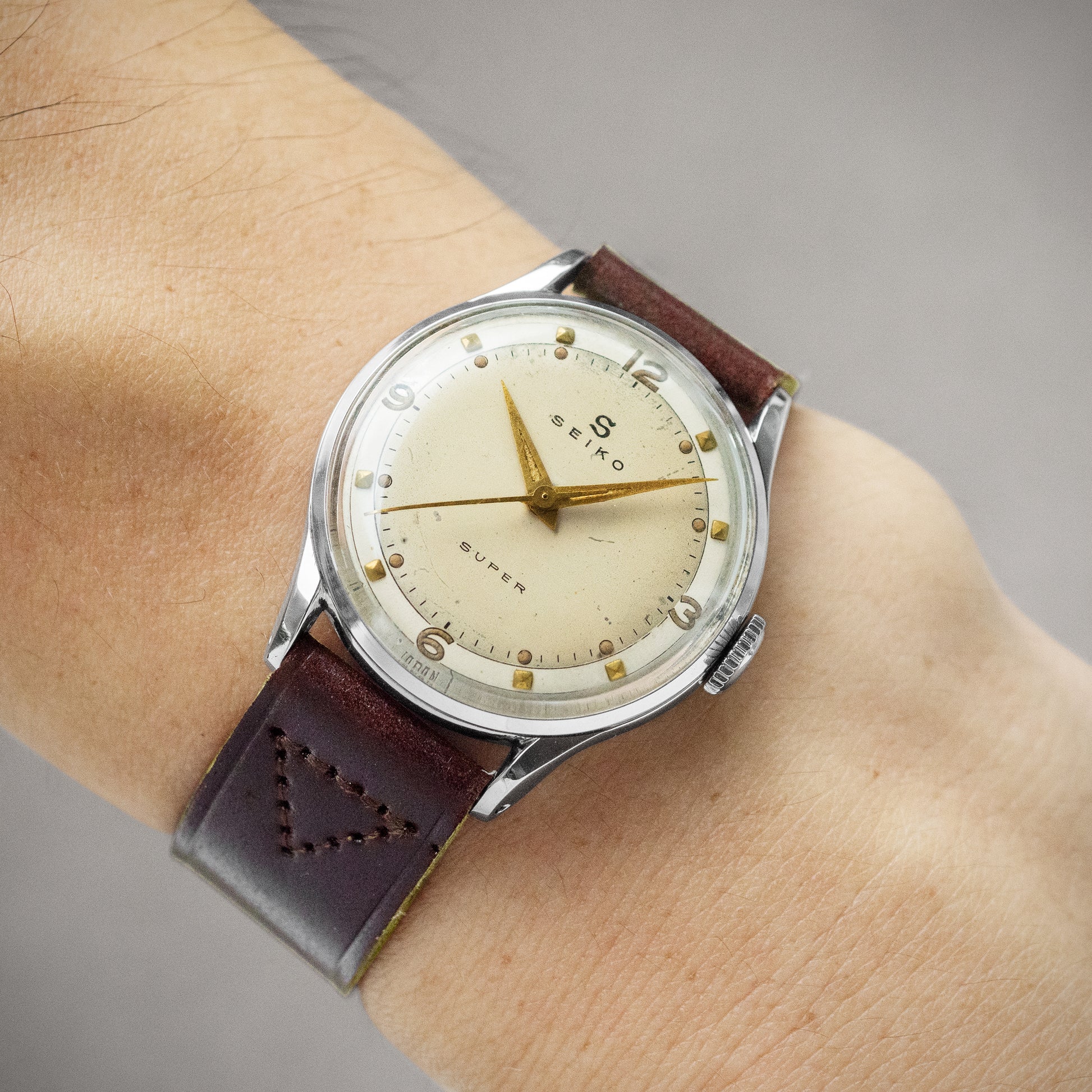 This Seiko Super manual winding watch from 1955 is a rare find, especially in such excellent condition given Japan's humid climate at the time (when air conditioning was not popular until the 1970s). The two-toned explorer dial is truly a beauty to see in person. This is a remarkable piece that any watch collector will appreciate.