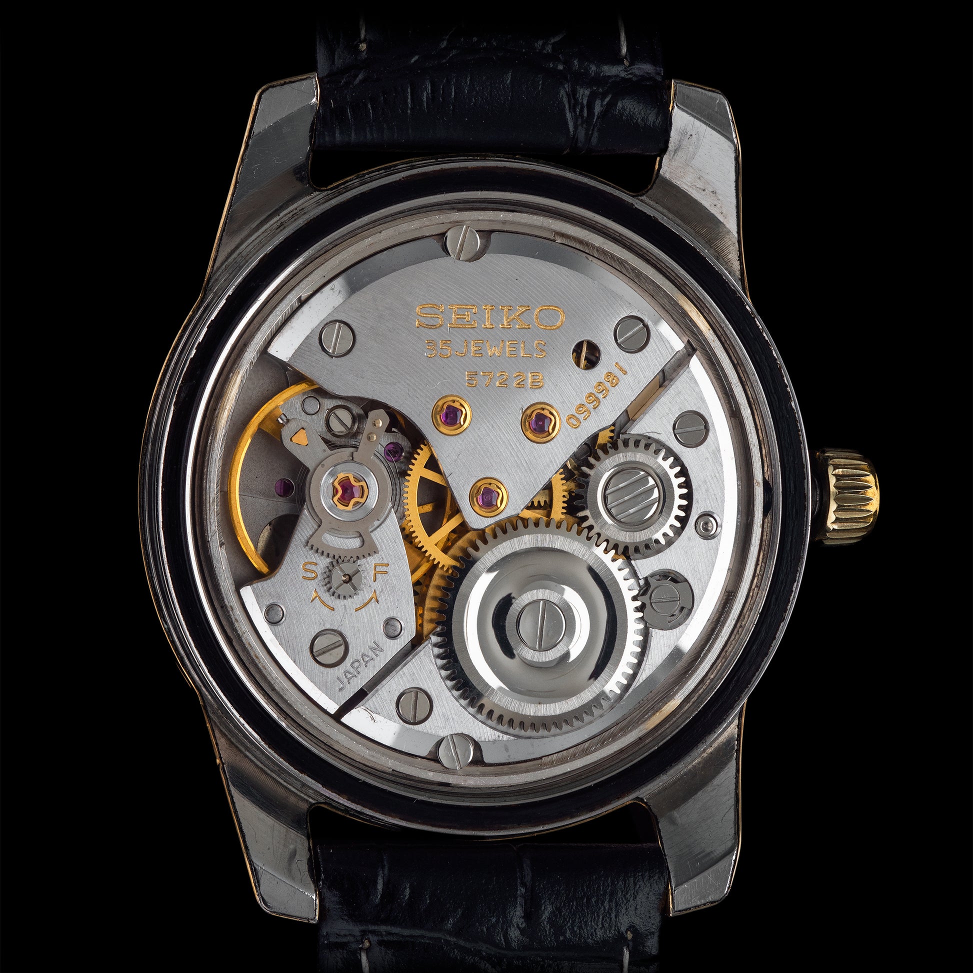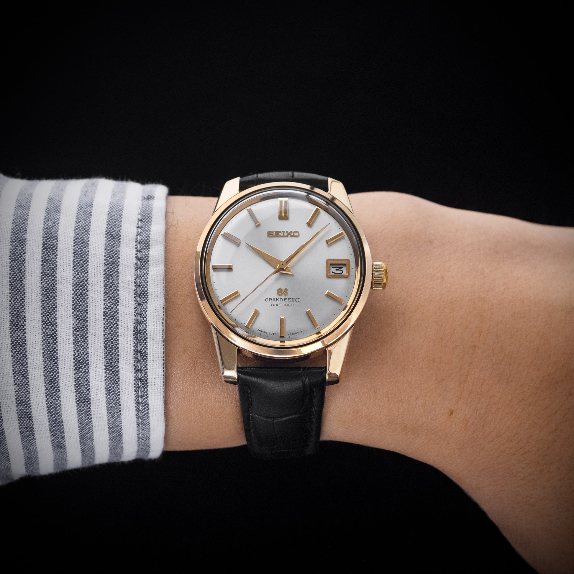 This Grand Seiko 2nd generation watch from 1967 features a beautiful sunburst dial and a rare cap gold case. The dial features a classic gothic "GS" logo and the text "Grand Seiko", which make this piece extra charming. This is truly a beautiful piece that any watch collector can appreciate.