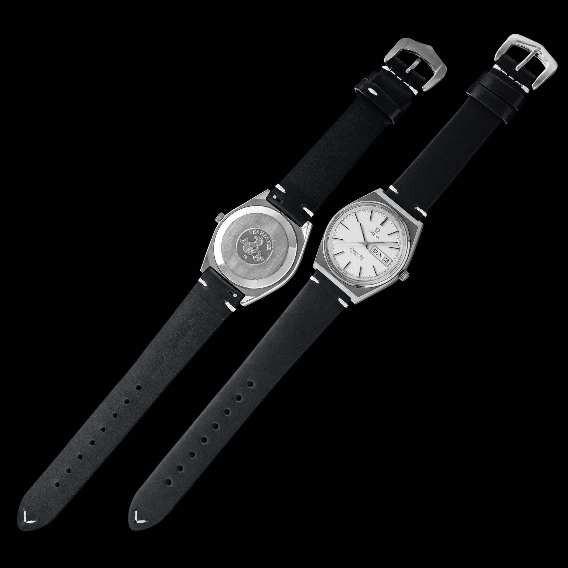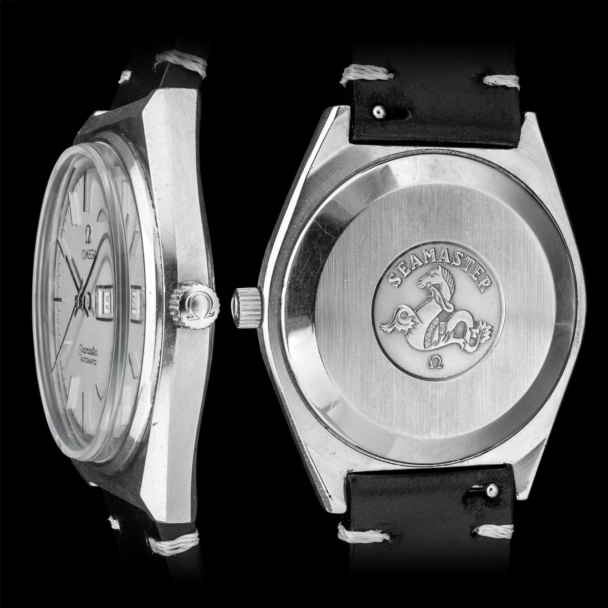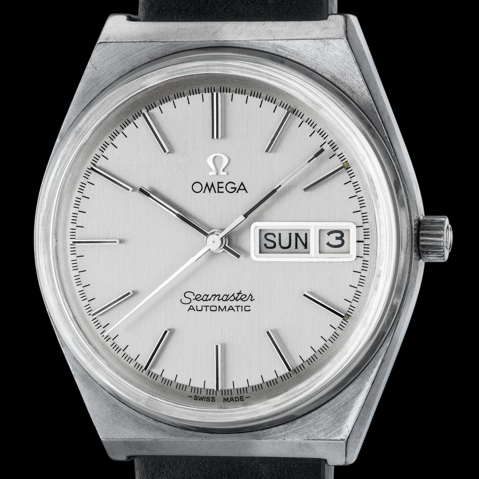 This 1979 Omega Seamaster Day-Date features a finely executed vertical brushed dial. It is powered by the Caliber 1020 automatic movement, known for its reliability and convenient quick-set functions: the date can be rapidly adjusted via the crown, and the day is advanced by turning the hour hand backward.