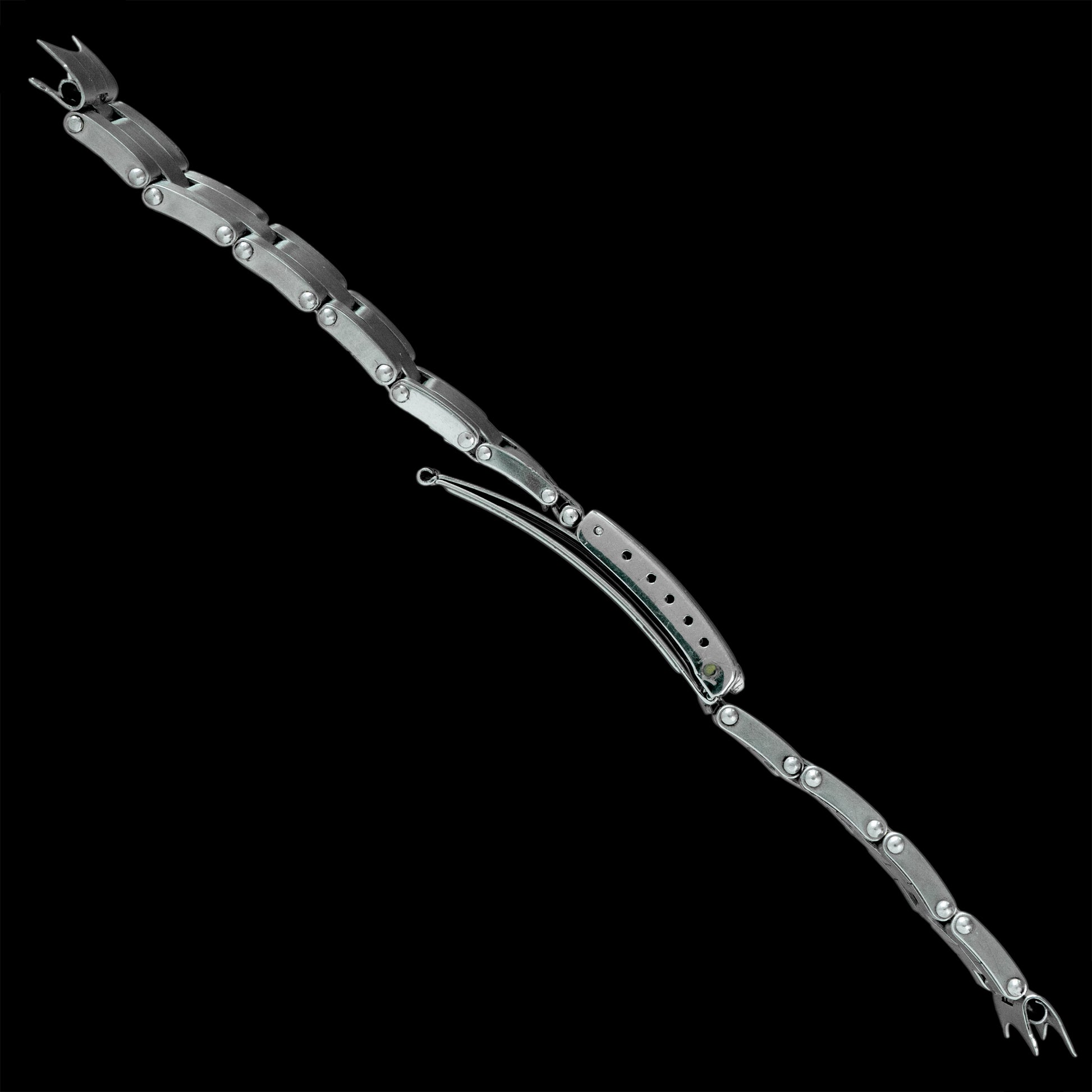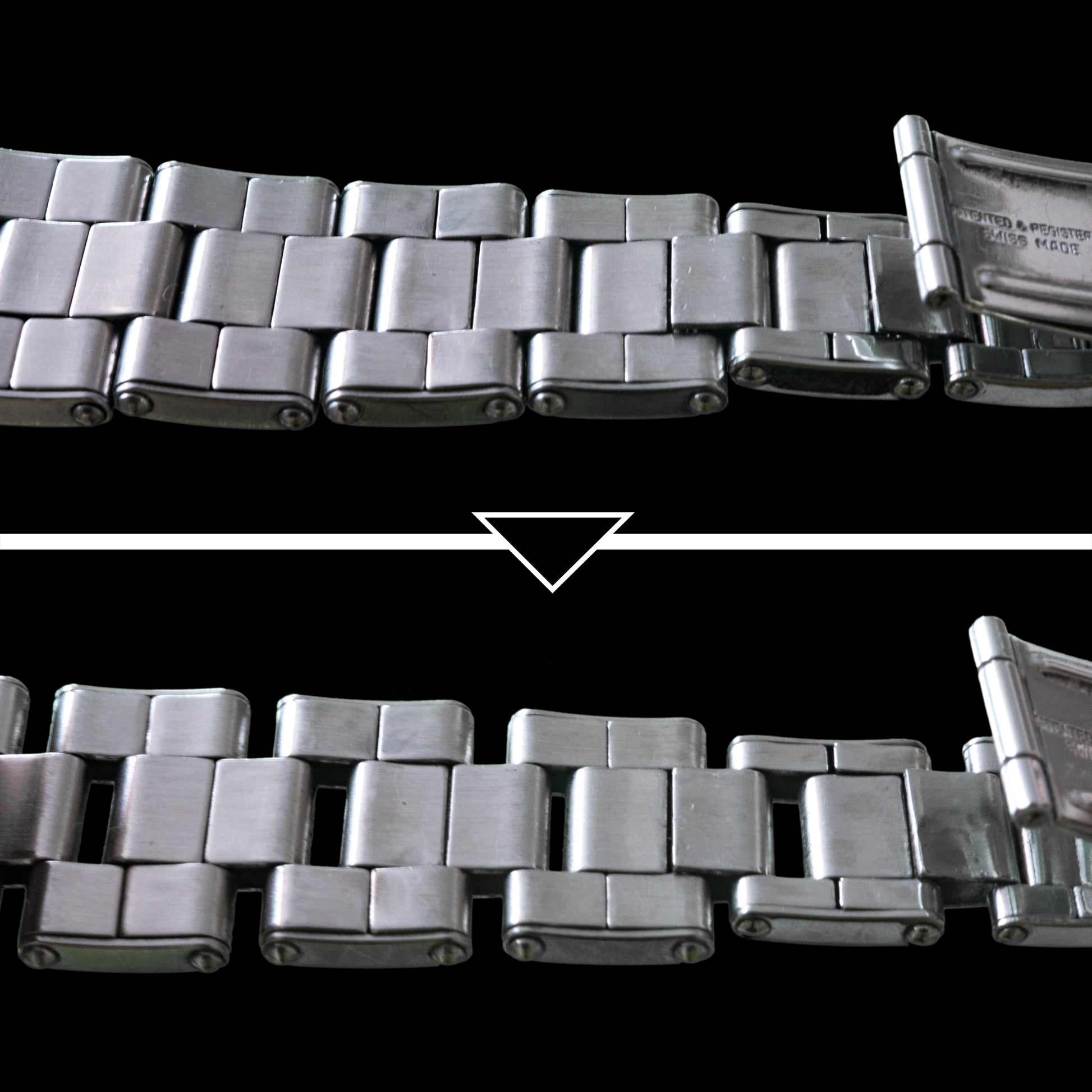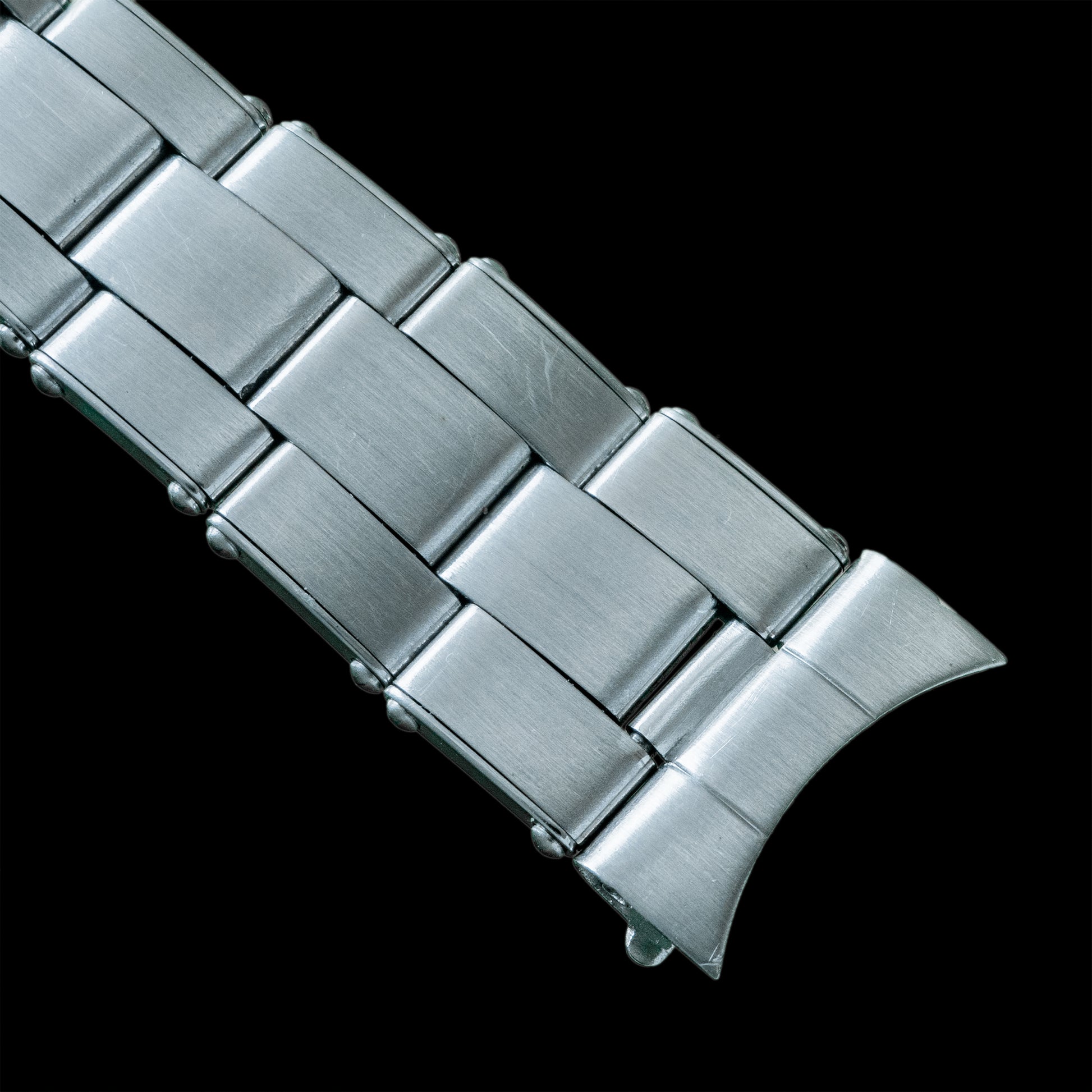 The first-generation Rolex Oyster bracelet is typically called the "rivet bracelet" because of the visible rivets on the outer edge that hold together the hollow, folded links. This gives it a very vintage look and feel. It is also quite light compared to later generations. This one is also able to "stretch" (Please see 4th photo).